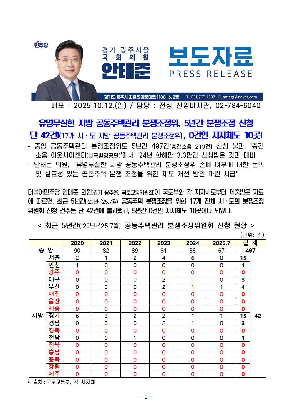 [안태준 의원 보도자료] 유명무실한 지방 공동주택관리 분쟁조정위, 5년간 분쟁조정 신청 단 42건!, 0건인 지자체도 10곳!