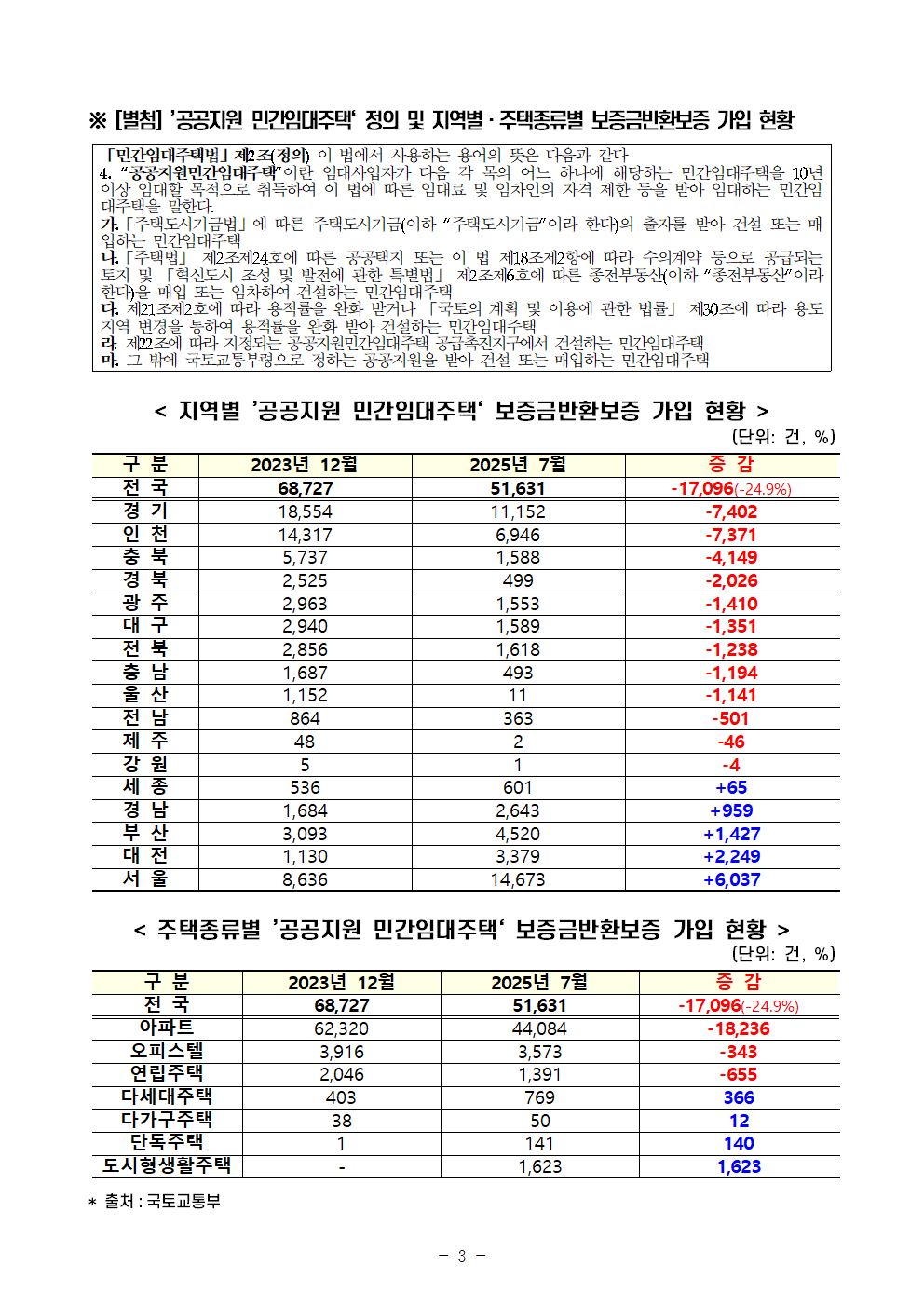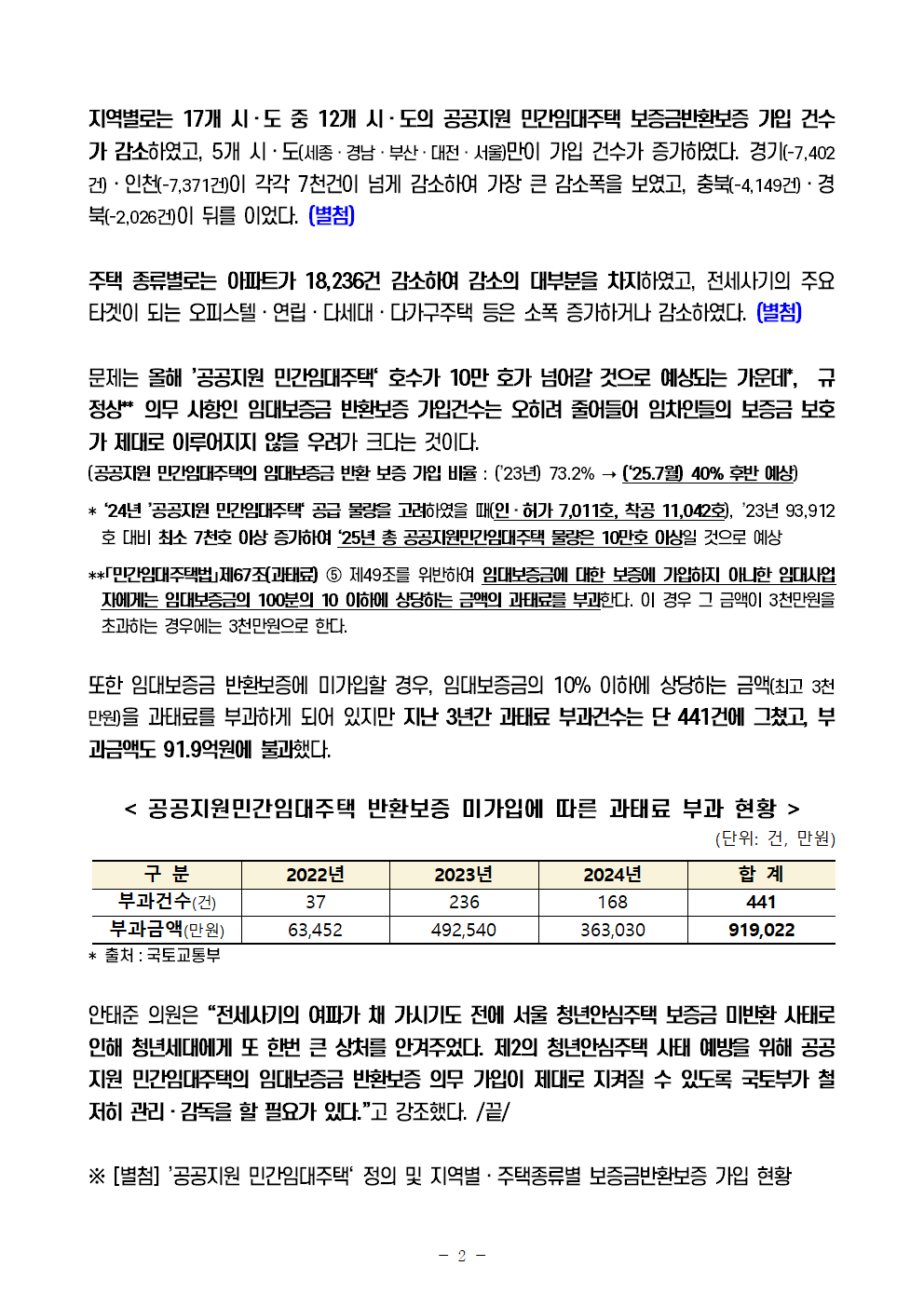 [안태준 의원 보도자료] ’민간임대주택‘ 보증금반환보증 의무 가입에도 가입 건수 1.3만건 이상 감소!