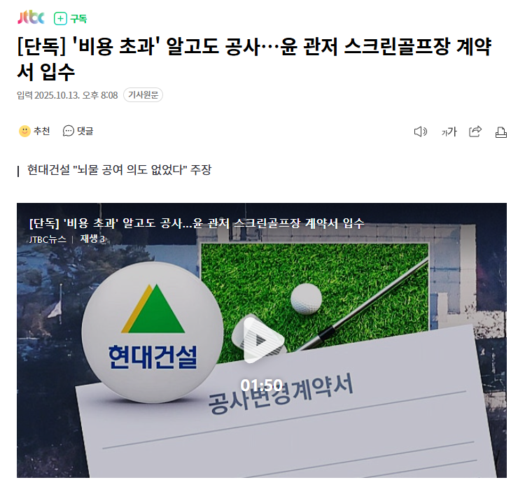그동안 현대건설이 보안을 이유로 공개하지 않았던 대통령 관저 스크린 골프장 계약서를 JTBC가 입수했습니다. 1억 3500만원에 계약을 했지만 실제 비용은 두 배 넘게 들었습니다. 건설사가 '비용이 더 들 걸 알고 있었다'고 실토하면서 사실상의 뇌물이 아니냔 의혹이 더 짙어졌습니다.