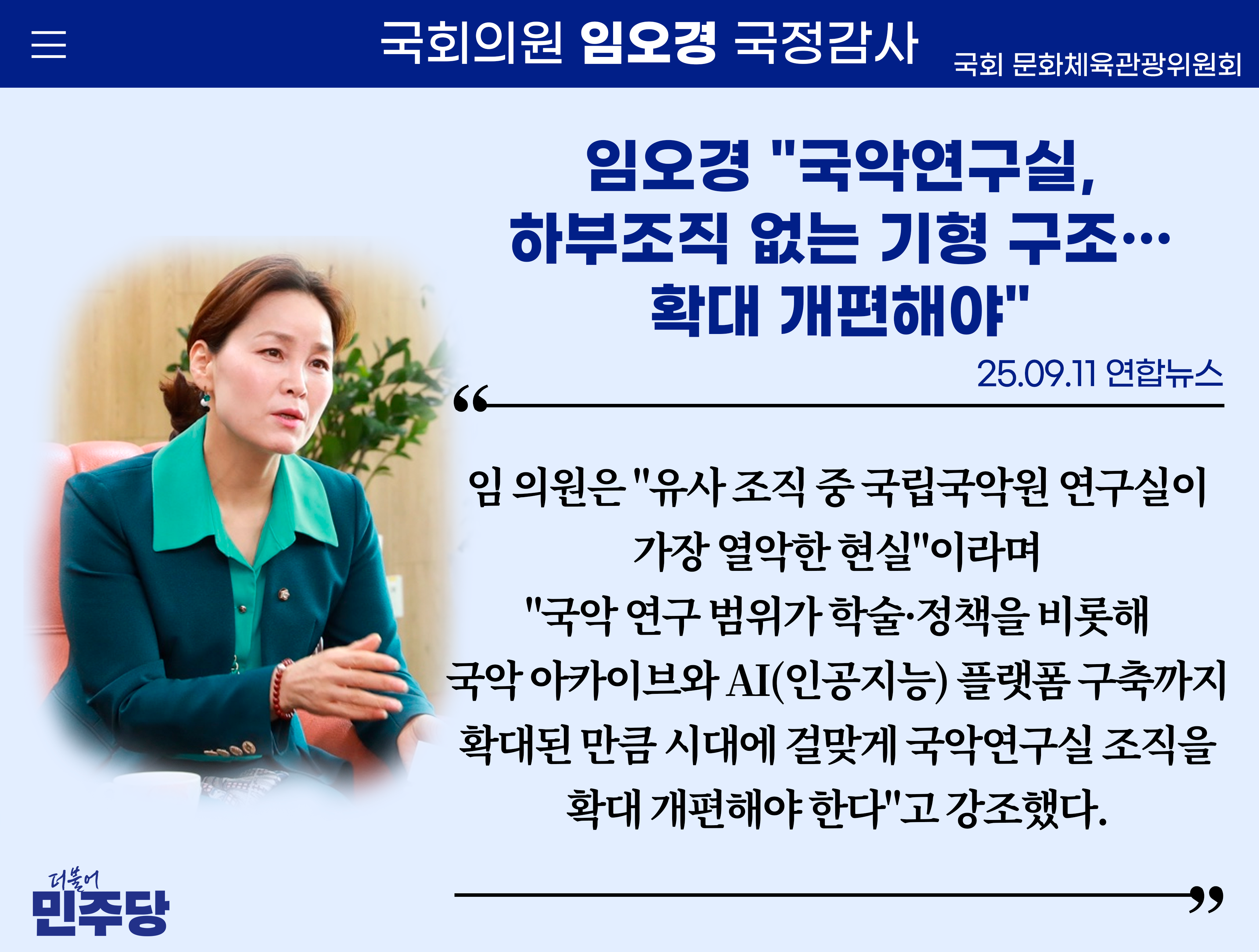 [임오경 카드뉴스] 연합뉴스 / 임오경 "국악연구실, 하부조직 없는 기형 구조…확대 개편해야