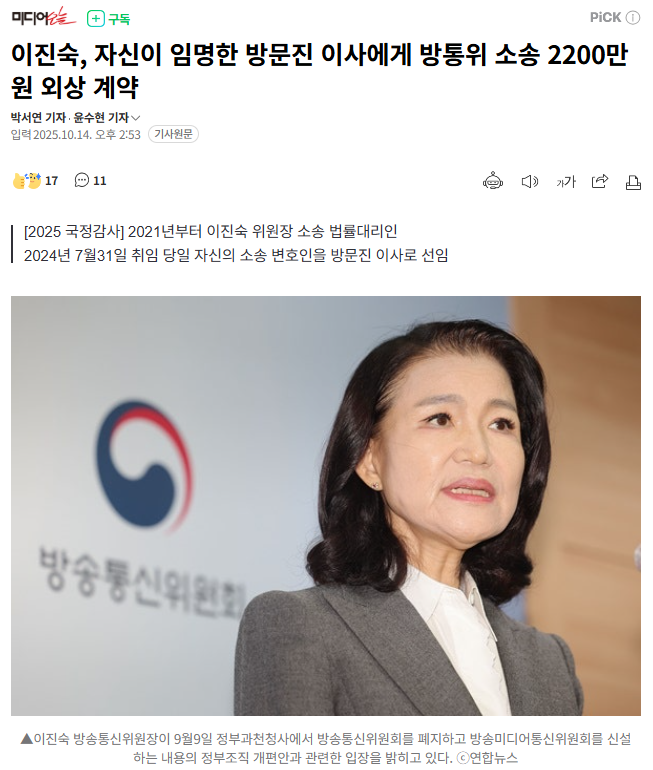 국회 과학기술정보방송통신위원회(과방위) 소속 황정아 더불어민주당 의원실이 방통위로부터 제출받은 행정소송 현황 자료를 미디어오늘이 확인한 결과, 방통위는 이진숙 당시 위원장의 지시에 따라 임무영 변호사에게 방통위 관련 소송 5건을 맡기고, 총 2200만 원의 외상 계약을 한 것으로 나타났다.