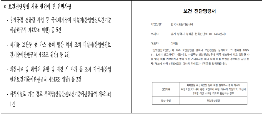 <한국니토옵티칼 보건진단명령 처분 원인 및 보건진단명령서>