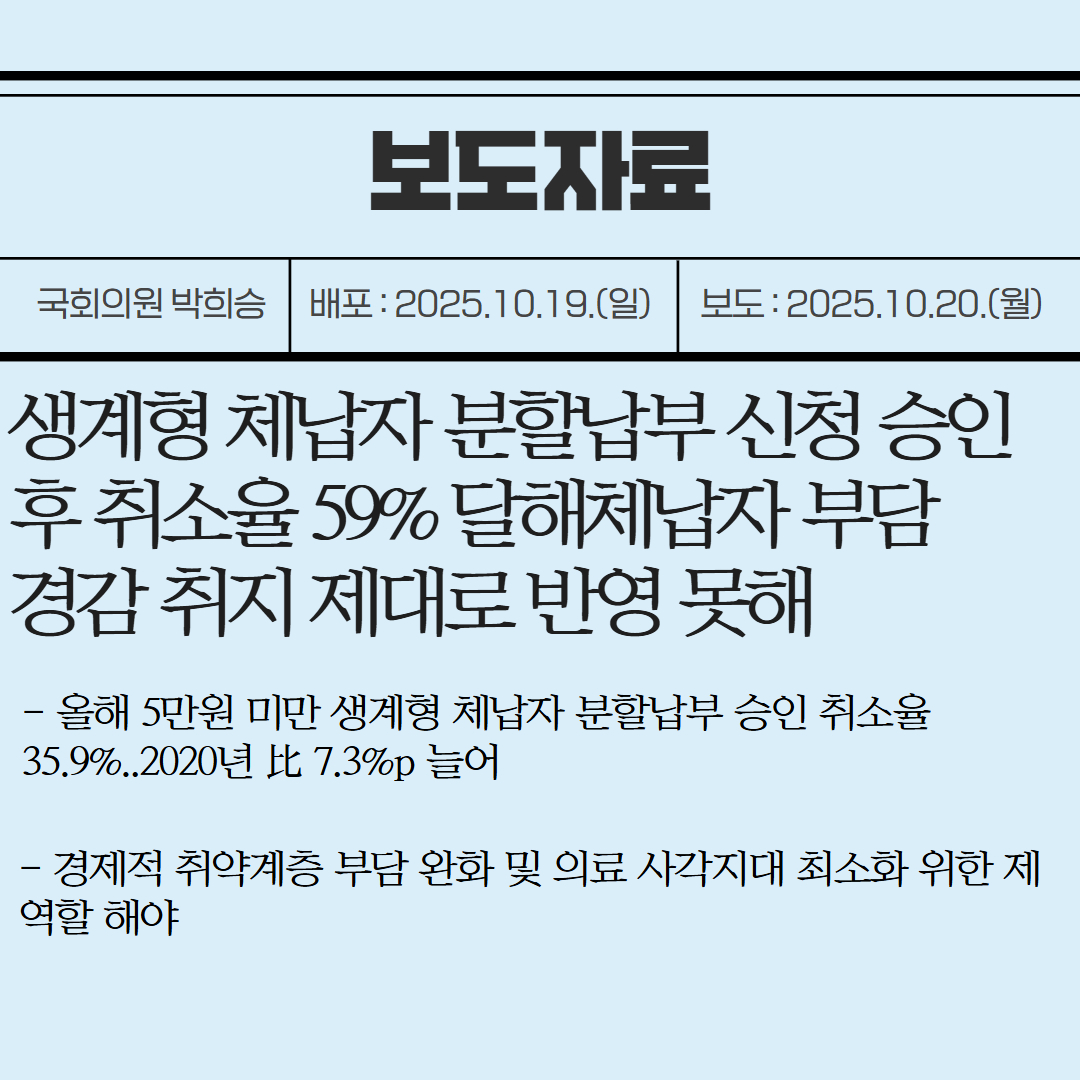 박희승 국회의원(더불어민주당, 남원장수임실순창, 보건복지위)이 국민건강보험공단으로부터 제출받은 자료를 분석한 결과, 올해 건강보험 체납세대 중 분할납부 신청·승인을 받았지만, 체납보험료를 납부하지 못해 분할납부 신청이 취소된 세대의 비율이 59%에 달하는 것으로 확인됐다[1].