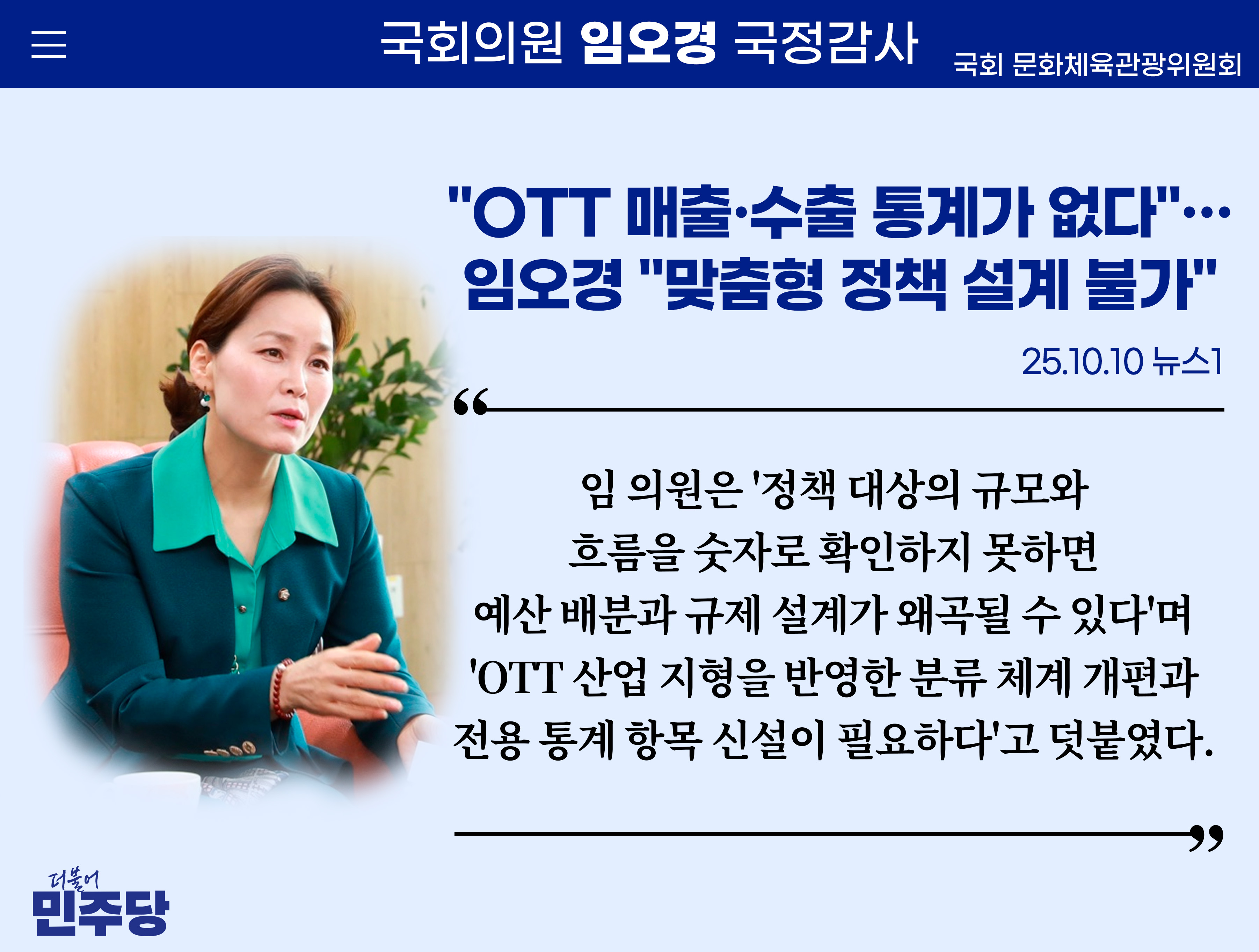 [임오경 카드뉴스]뉴스1 / "OTT 매출·수출 통계가 없다"…임오경 "맞춤형 정책 설계 불가"