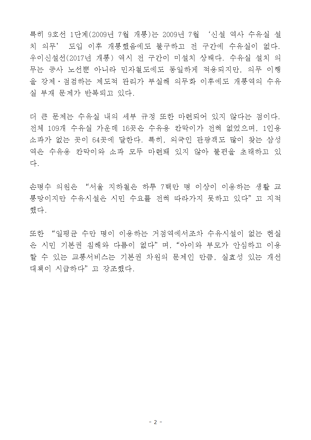[국회의원 손명수 보도자료] 서울지하철 수유실 설치율 31.2%…주요 거점역 대부분 ‘사각지대’