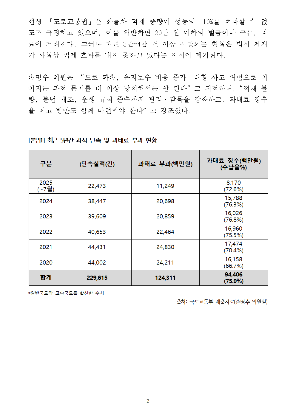 [국회의원 손명수 보도자료] “화물차 과적 5년간 23만 건 적발… 과태료 부과에도 징수율은 70%대 ‘제자리’”