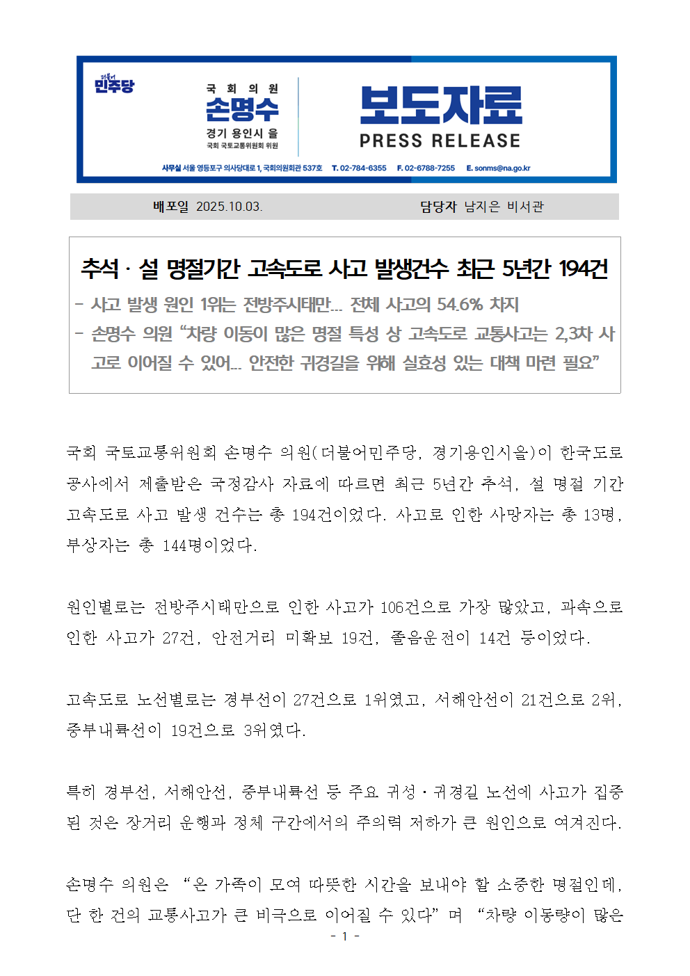 [국회의원 손명수 보도자료] 추석 ‧ 설 명절기간 고속도로 사고 발생건수 최근 5년간 194건