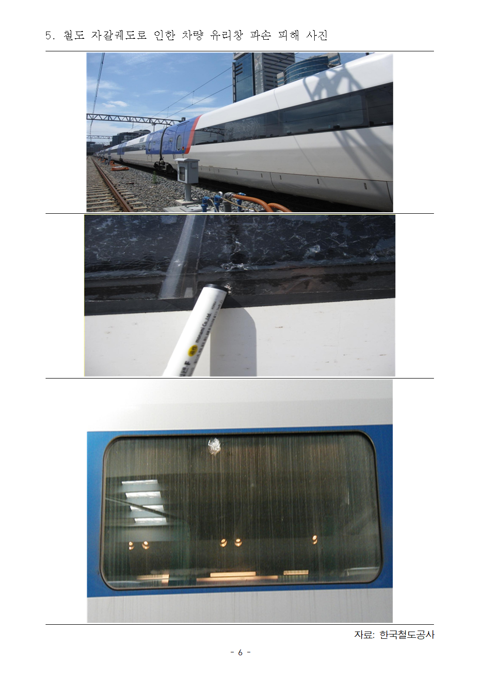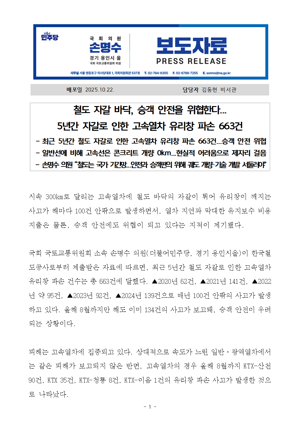 [국회의원 손명수 보도자료] 철도 자갈 바닥, 승객 안전을 위협한다... 5년간 자갈로 인한 고속열차 유리창 파손 663건