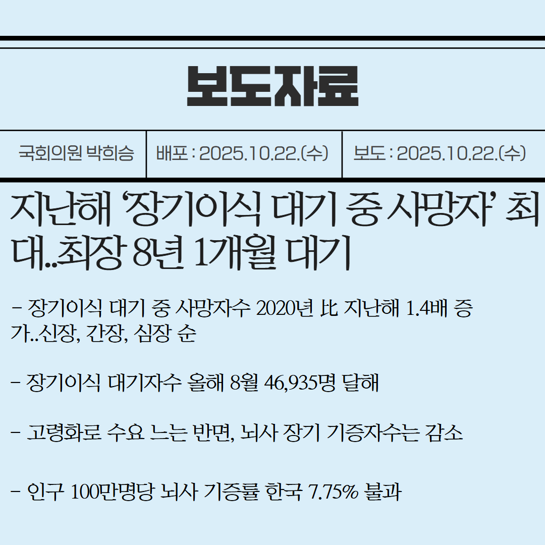 [국회의원 박희승 보도자료] 지난해 ‘장기이식 대기 중 사망자’ 최대..최장 8년 1개월 대기