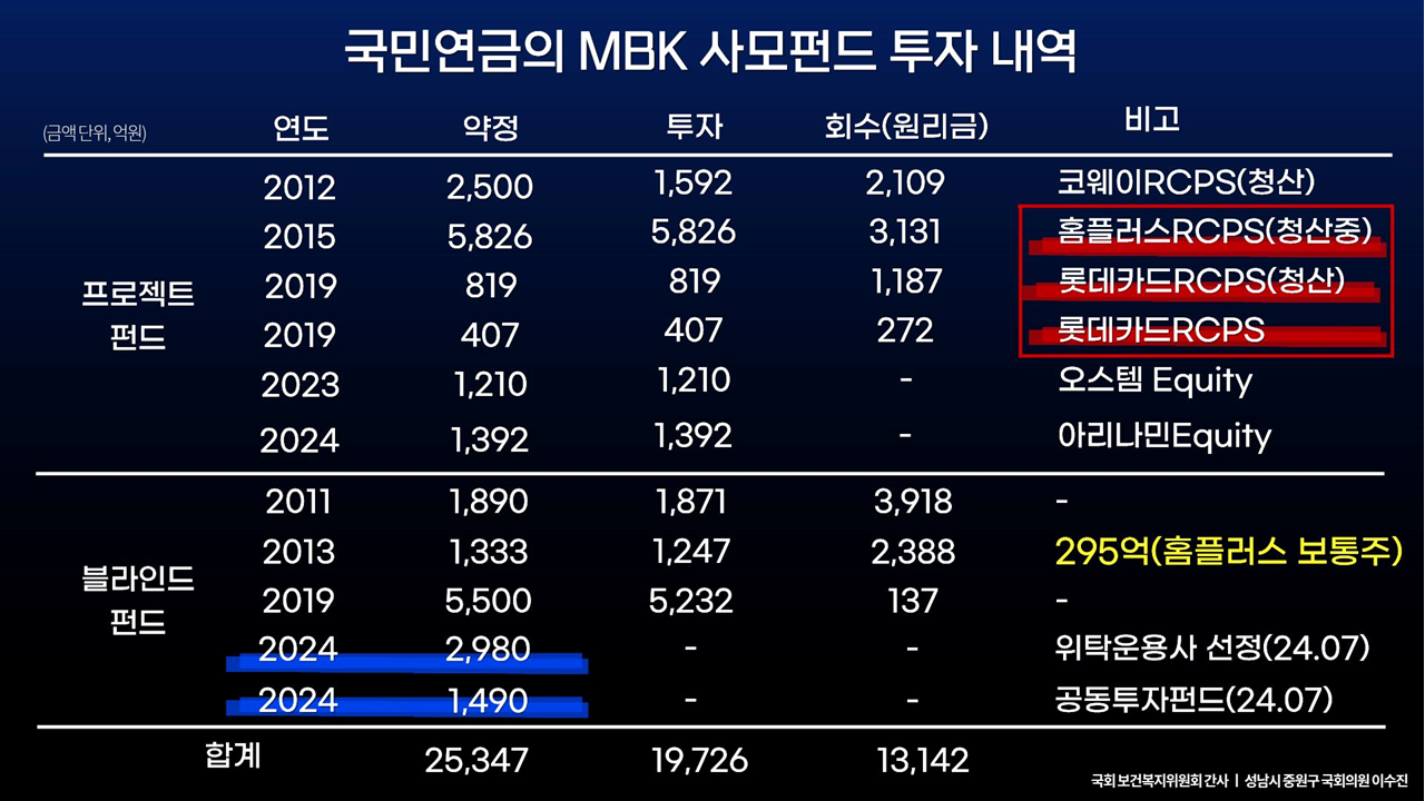 〇 국민연금은 2011년부터 총 11회에 걸쳐 MBK에 1조 9,726억을 투자, 24년 말 기준 원리금 1조 3,142억 회수.