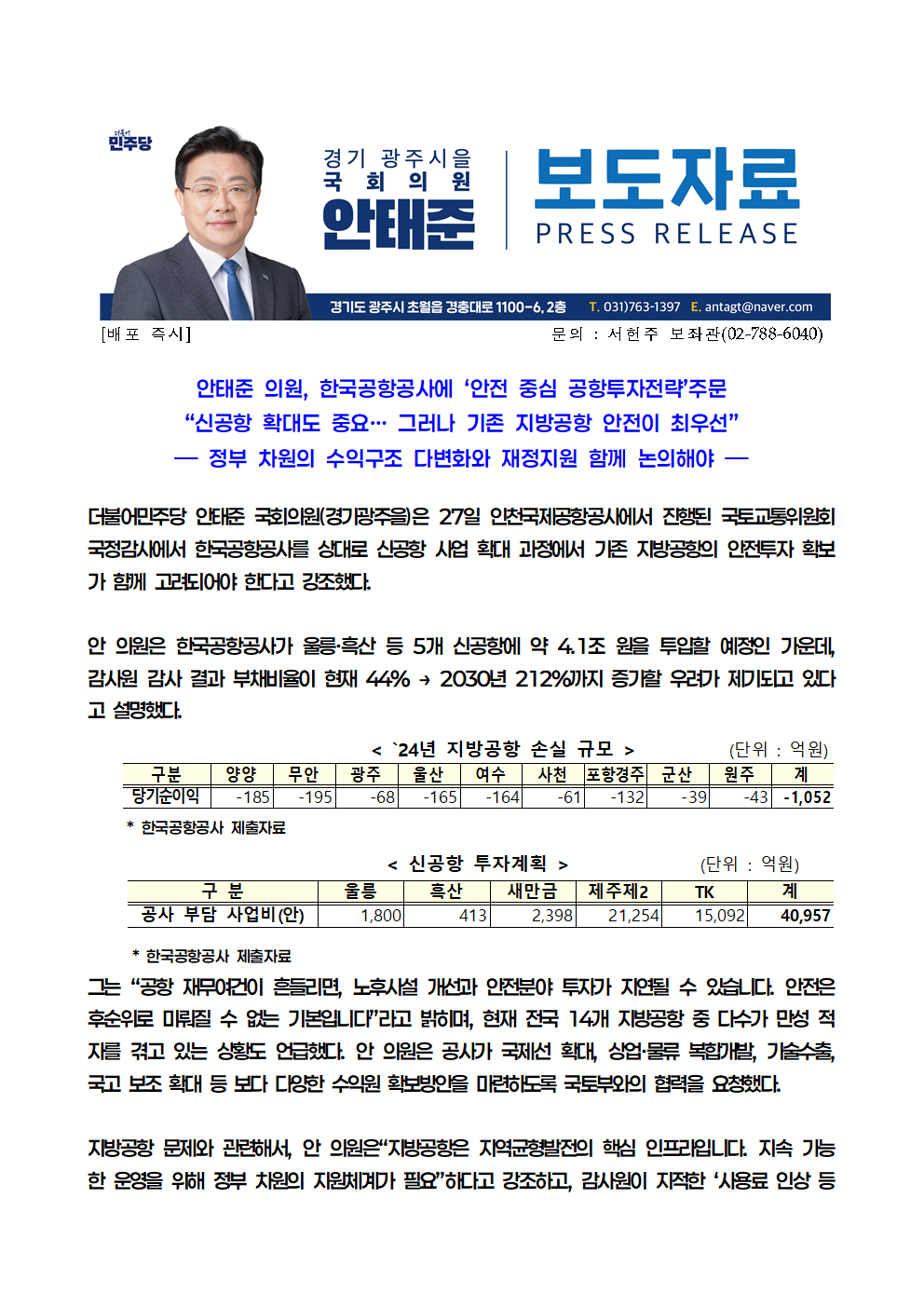 [안태준 의원 보도자료] 안태준 의원, 한국공항공사에 ‘안전 중심 공항투자전략’ 주문