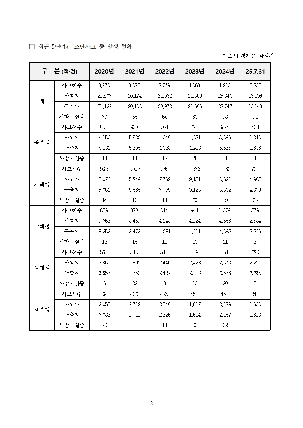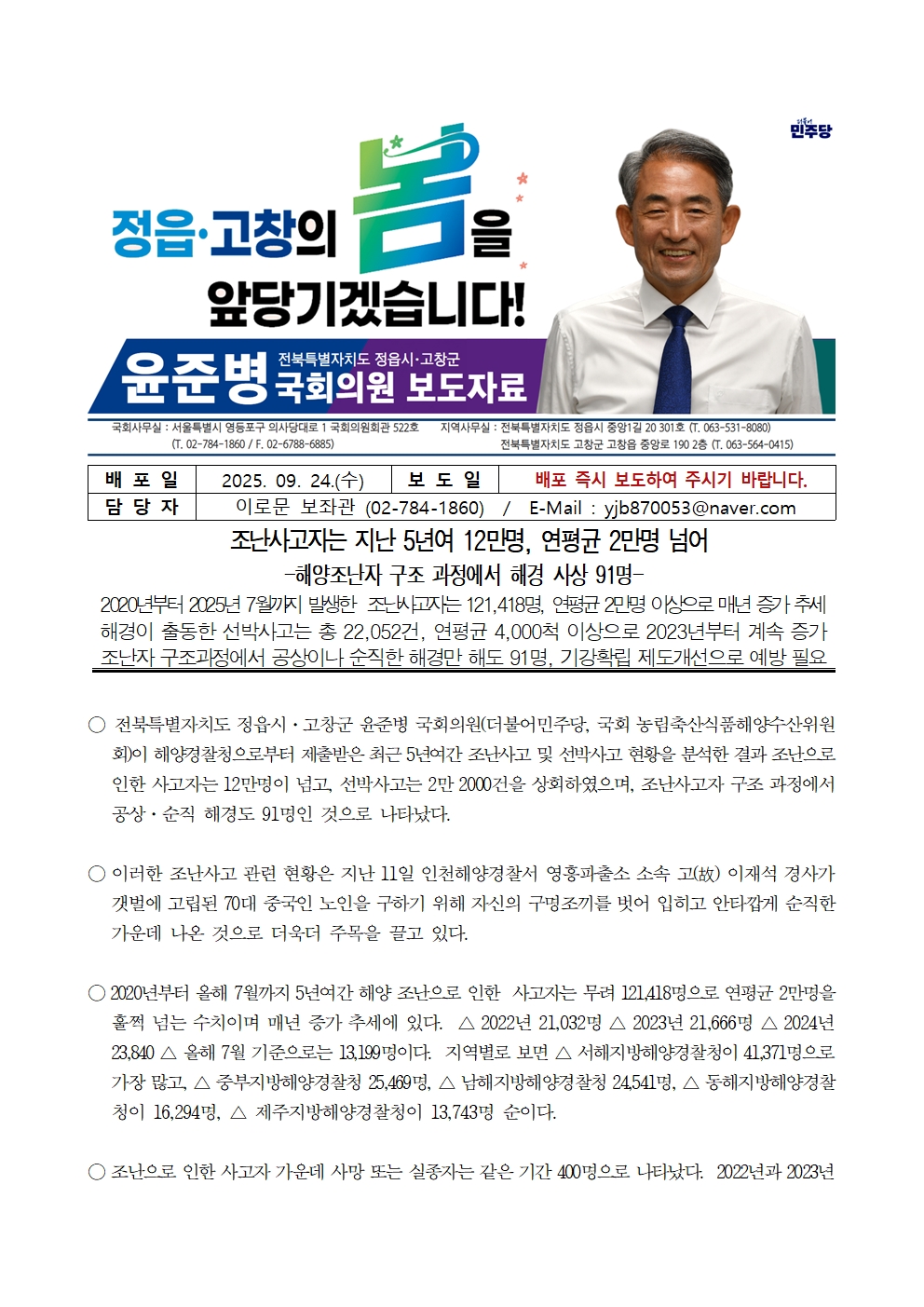 250924 [윤준병 의원 국정감사 보도자료] 윤준병 의원 해경 조난사고자는 지난 5년여 12만명 연평균 2만명 넘어.hwp