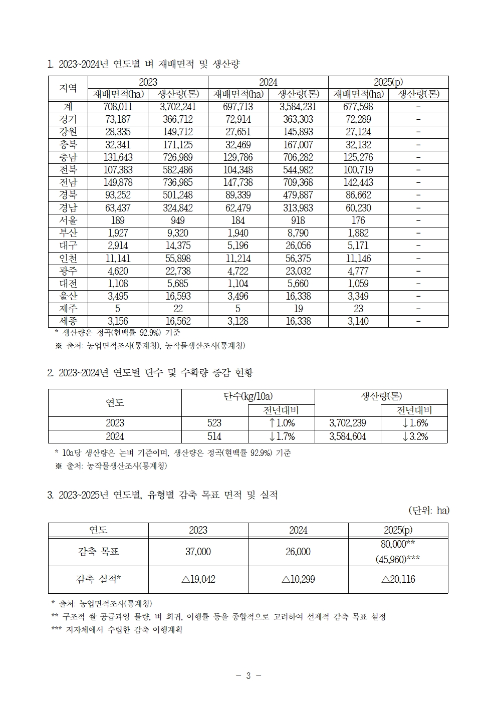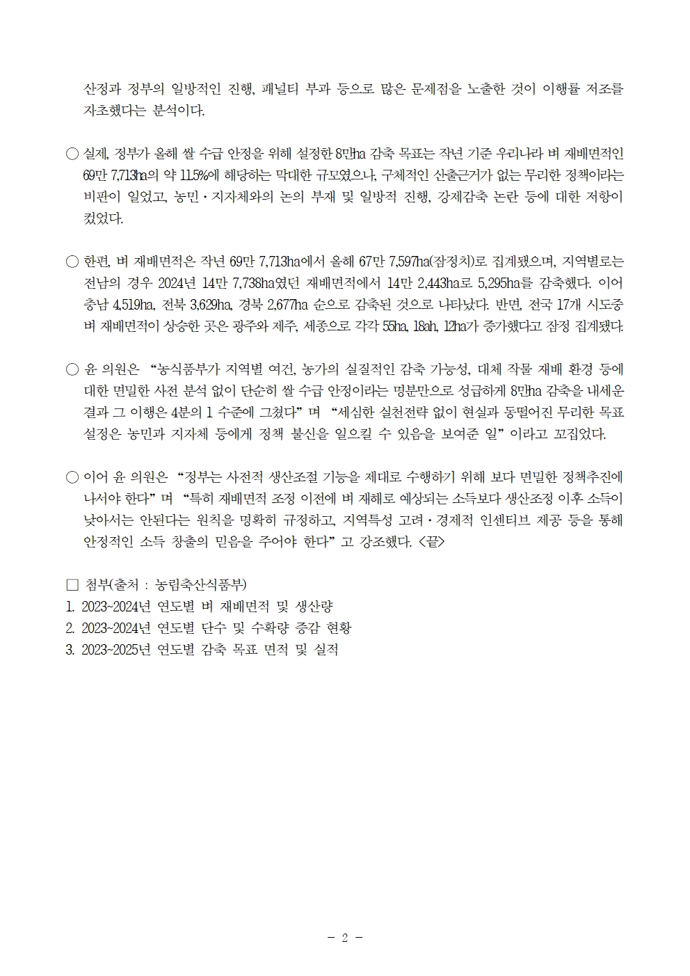 251013 [윤준병 의원 국정감사 보도자료] 윤준병 의원 “벼 재배면적 8만ha 조정목표 이행률 단 25% 불과”.hwp