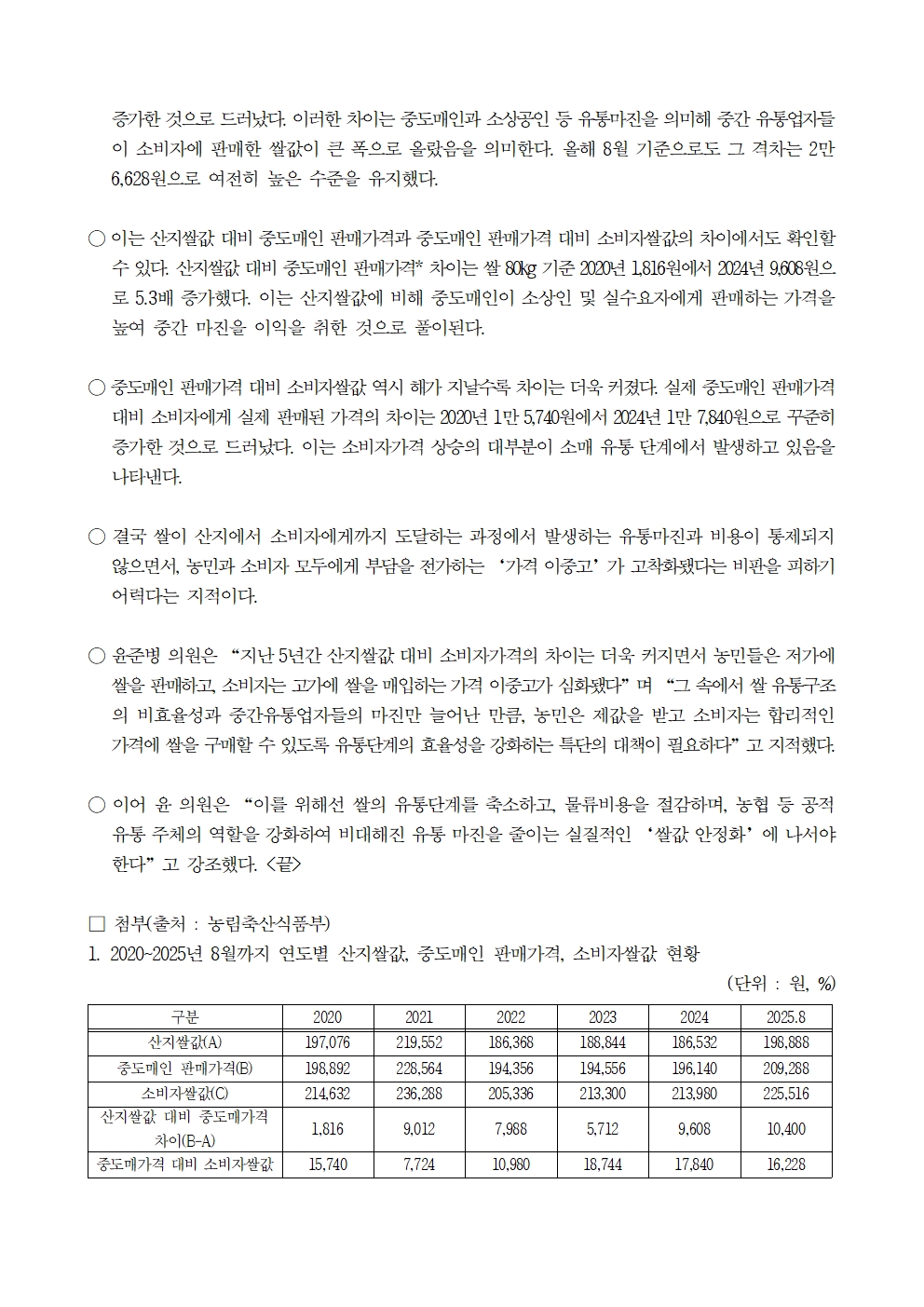 251014 [윤준병 의원 국정감사 보도자료] 5년간 농민은 저가에 팔고 소비자는 고가에 사는 쌀 가격 이중고 심화!.hwp