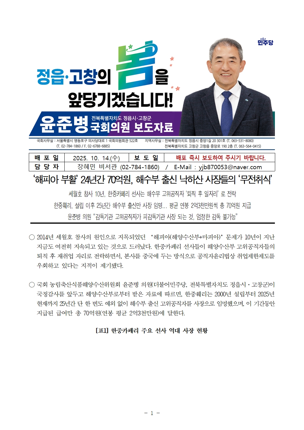 251015 [윤준병 의원 국정감사 보도자료] ‘해피아 부활’ 24년간 70억원 무전취식.hwp