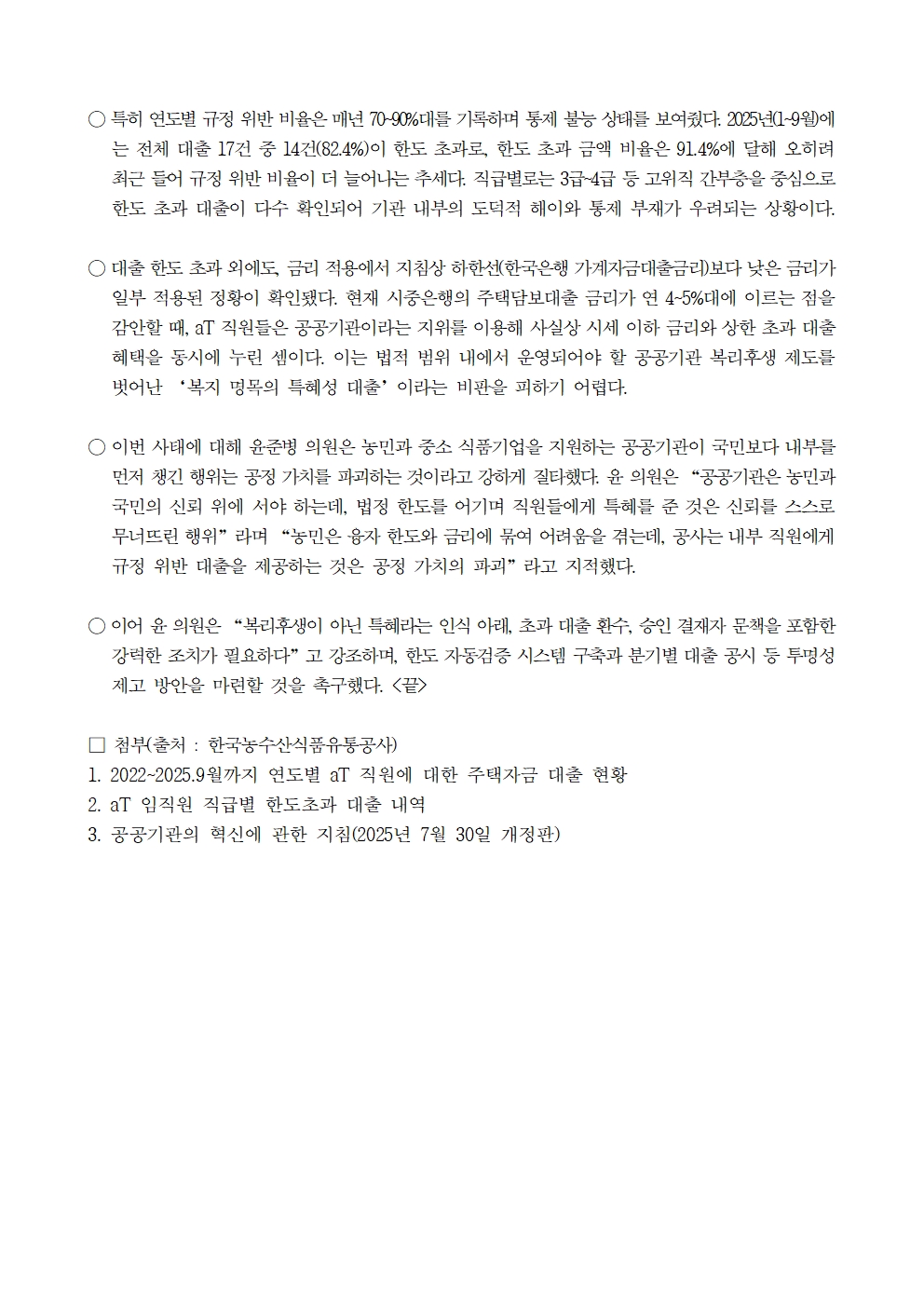 251017 [윤준병 의원 국정감사 보도자료] aT 정부 지침 무시하며 임직원 주택자금 특혜 대출 상시 운영.hwp