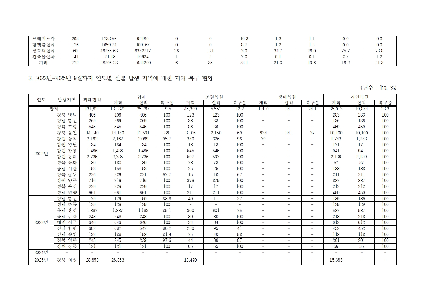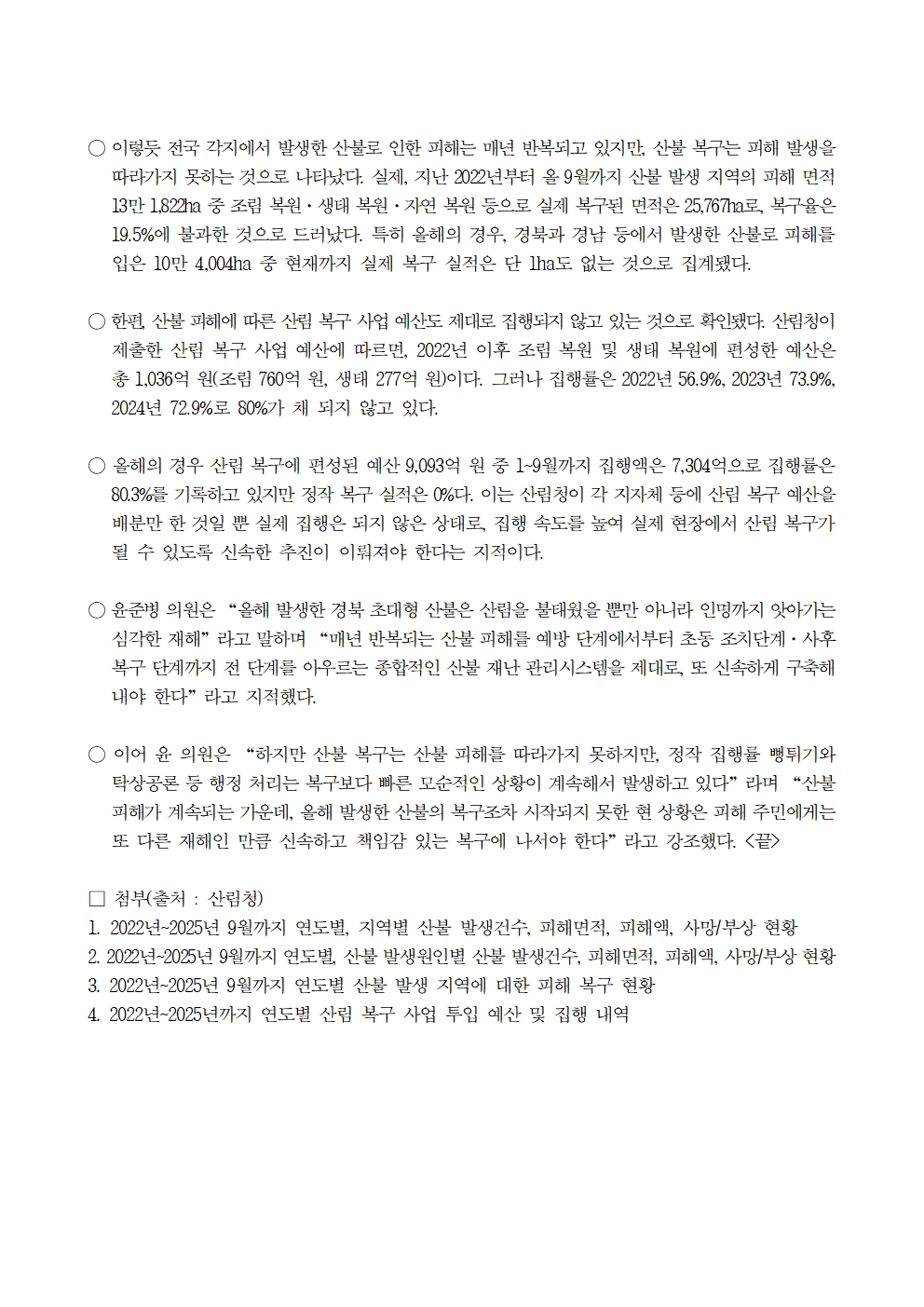 [윤준병 의원 국정감사 보도자료]_최근 3년간 산불_피해액_8.3조원에 달하지만 산림 복구율은 19.5%_불과