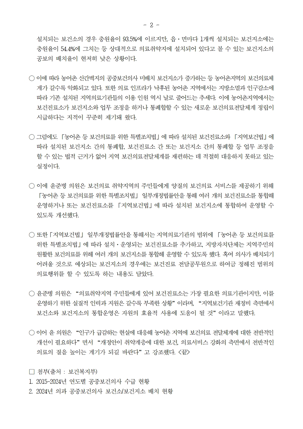 251027 [윤준병 의원 국정감사 보도자료] 윤준병 의원 국정감사 입법대안 ‘농어촌 보건의료서비스 향상법’ 발의!.hwp
