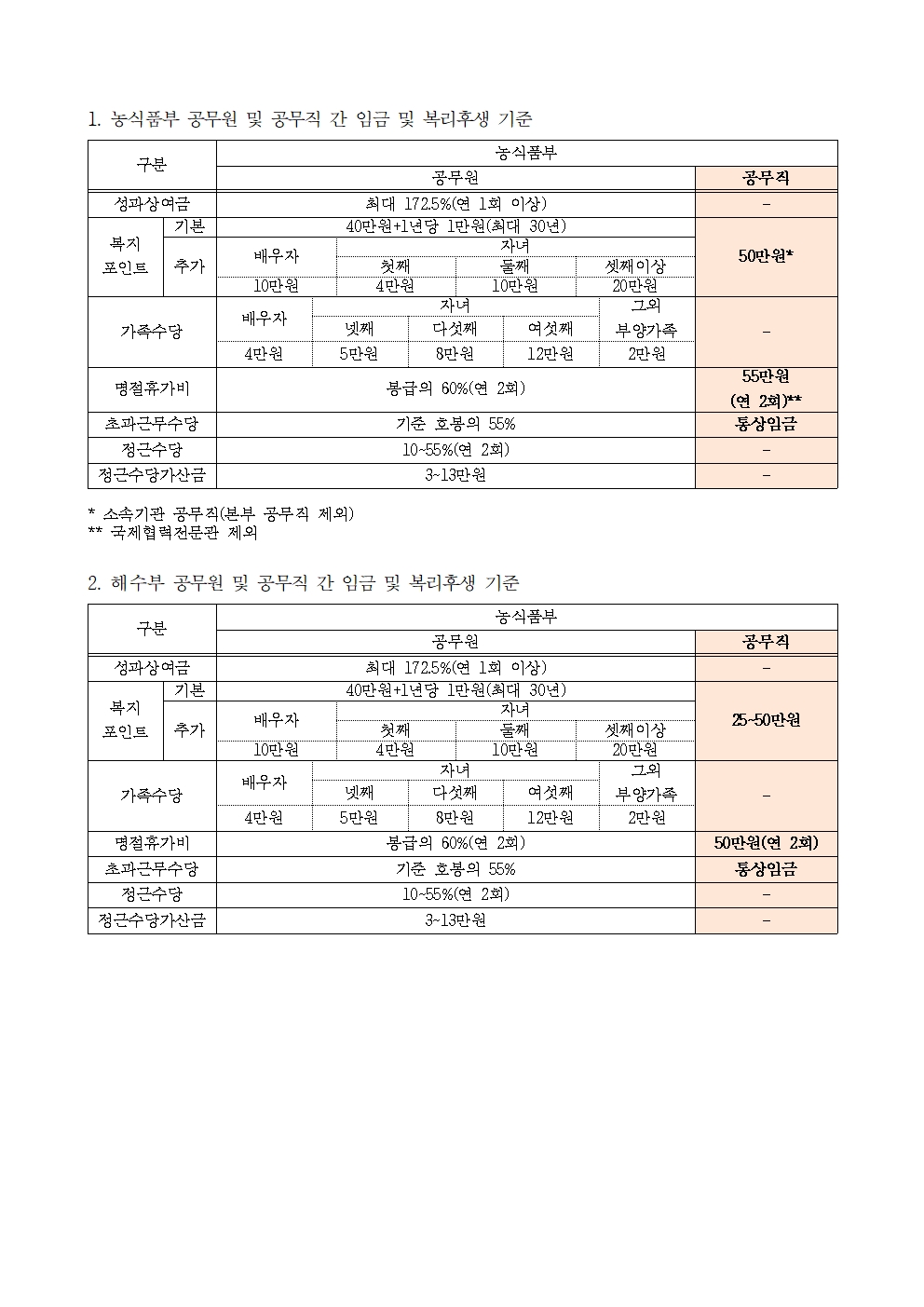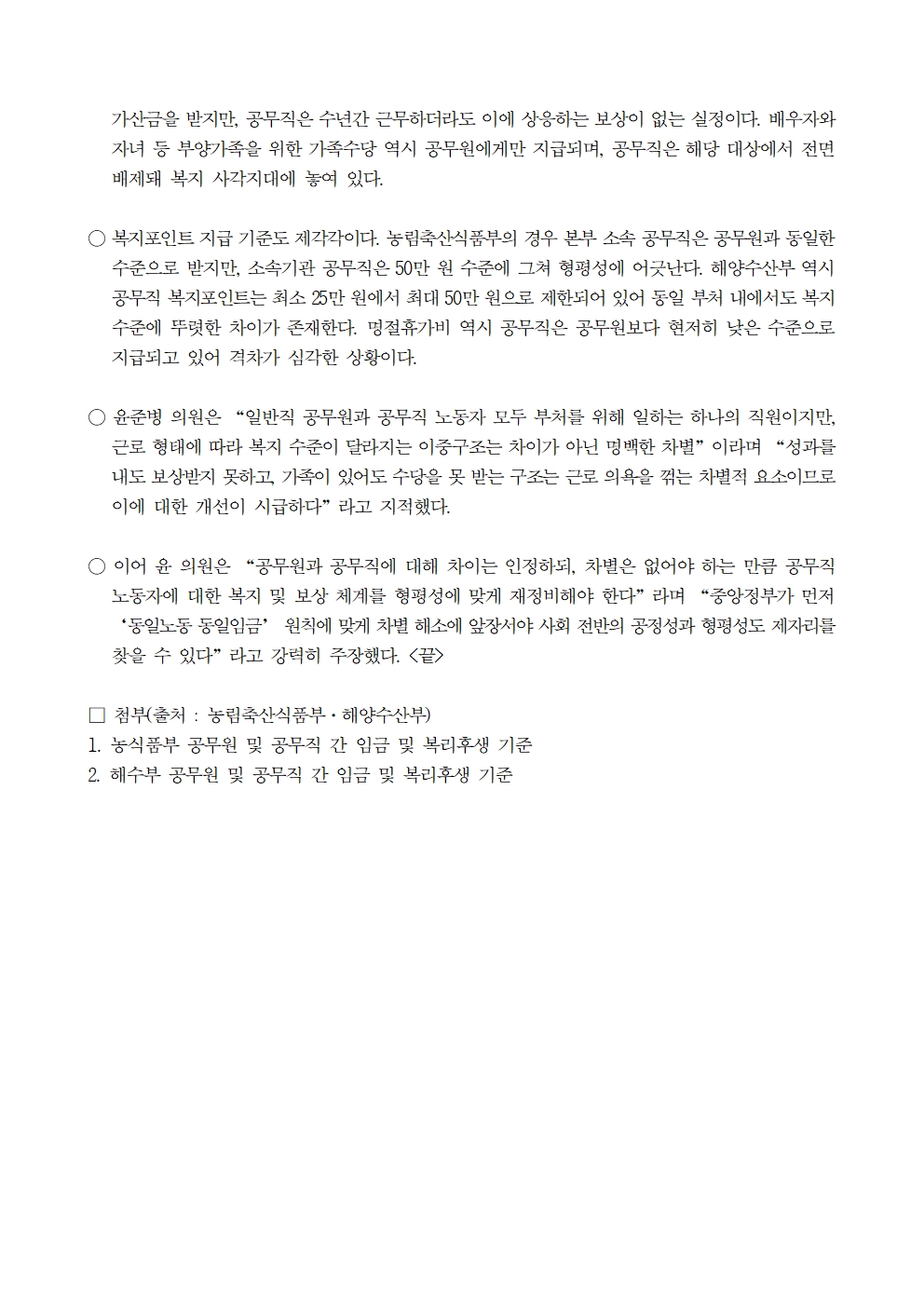 [윤준병 의원 국정감사 보도자료] 농식품부·해수부 일반공무원과 정규직 전환 공무직 간 복리후생 차별