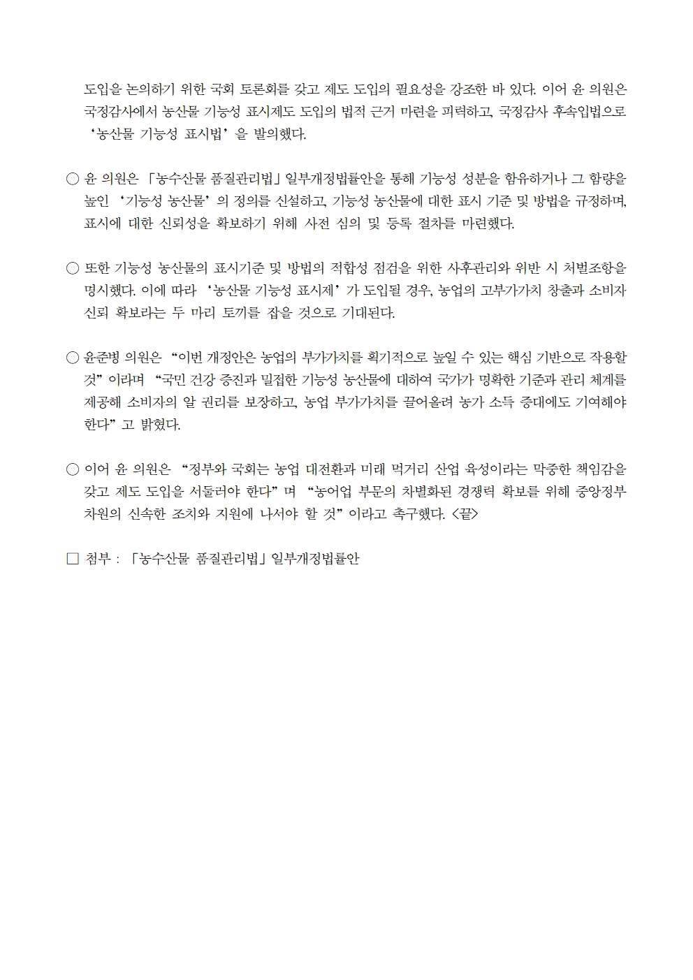 251029 [윤준병 의원 국정감사 보도자료] 윤준병 의원 ‘농산물 기능성 표시법’ 발의로 국정감사 대안 제시!.hwp