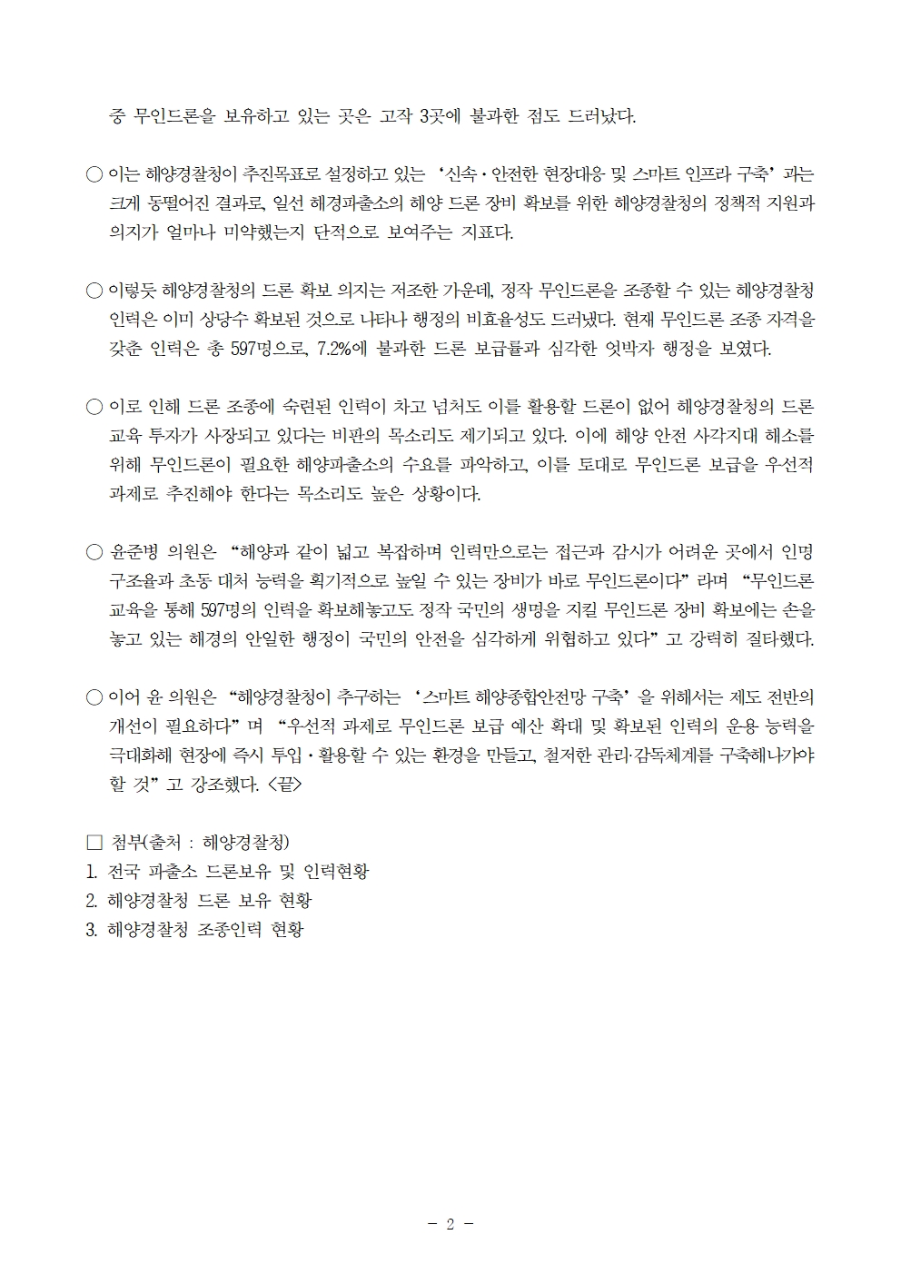 [윤준병 의원 국정감사 보도자료] 해경 드론조종인력 600명 달하지만, 해경파출소 무인드론 보급은 7.2% 불과