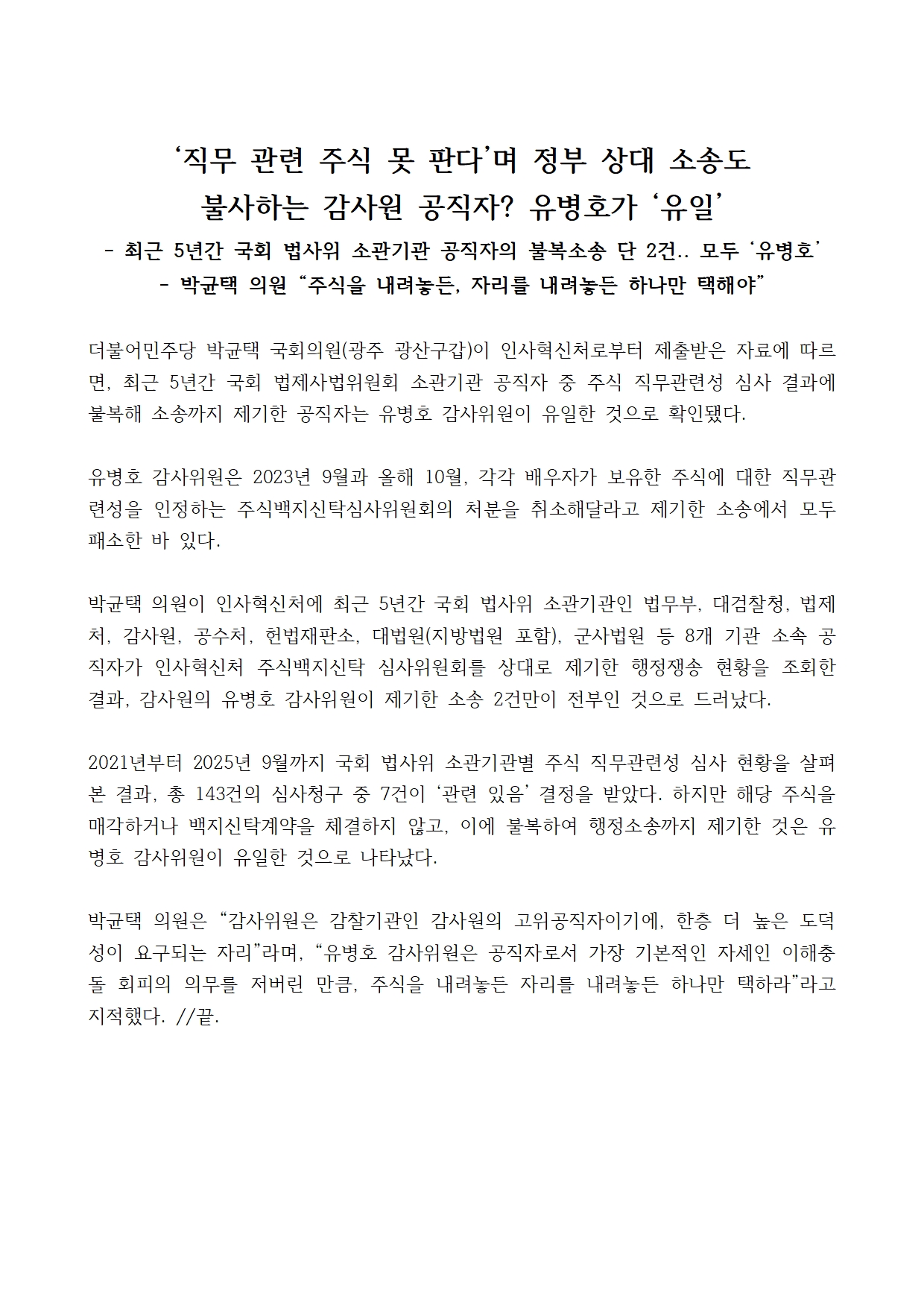 [박균택 의원 국정감사 보도자료] ‘직무 관련 주식 못 판다’며 정부 상대 소송도 불사하는 감사원 공직자? 유병호가 ‘유일’