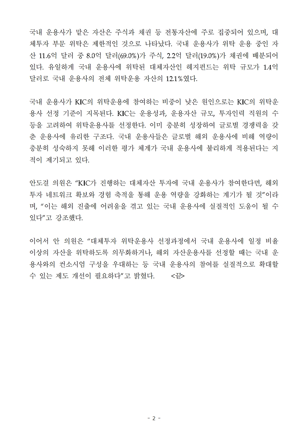 [국회의원 안도걸 보도자료] KIC 국내 운용사 위탁 비중 여전히 1%대 불과...