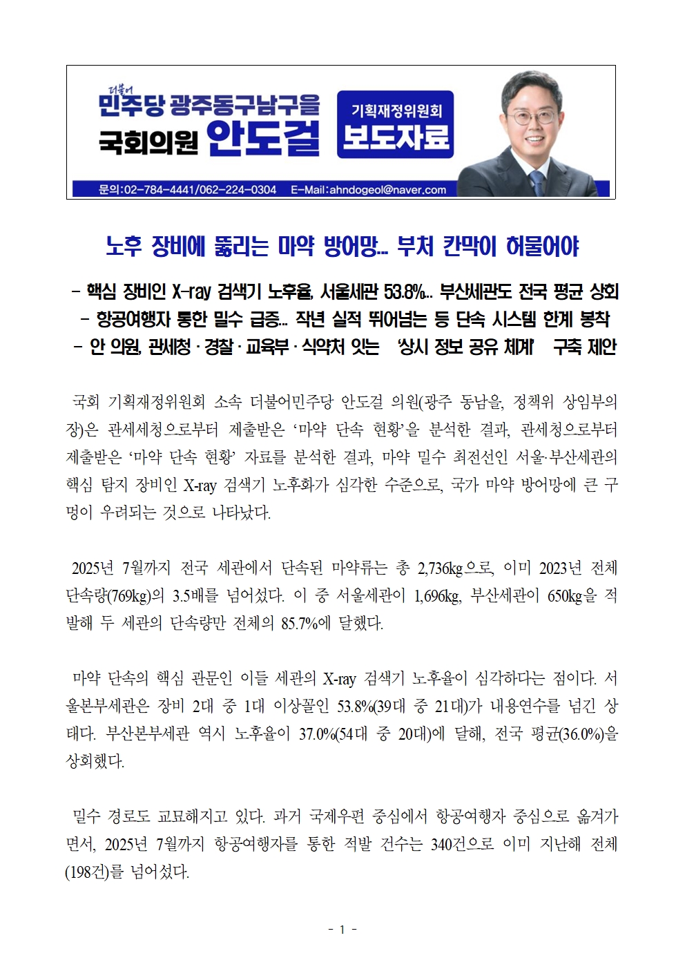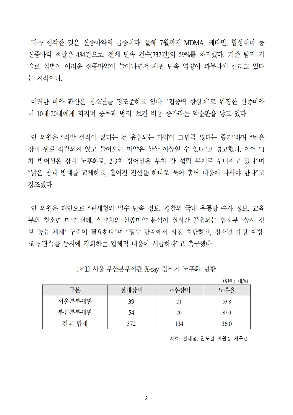 [국회의원 안도걸 보도자료] 노후 장비에 뚫리는 마약 방어망... 부처 칸막이 허물어야
