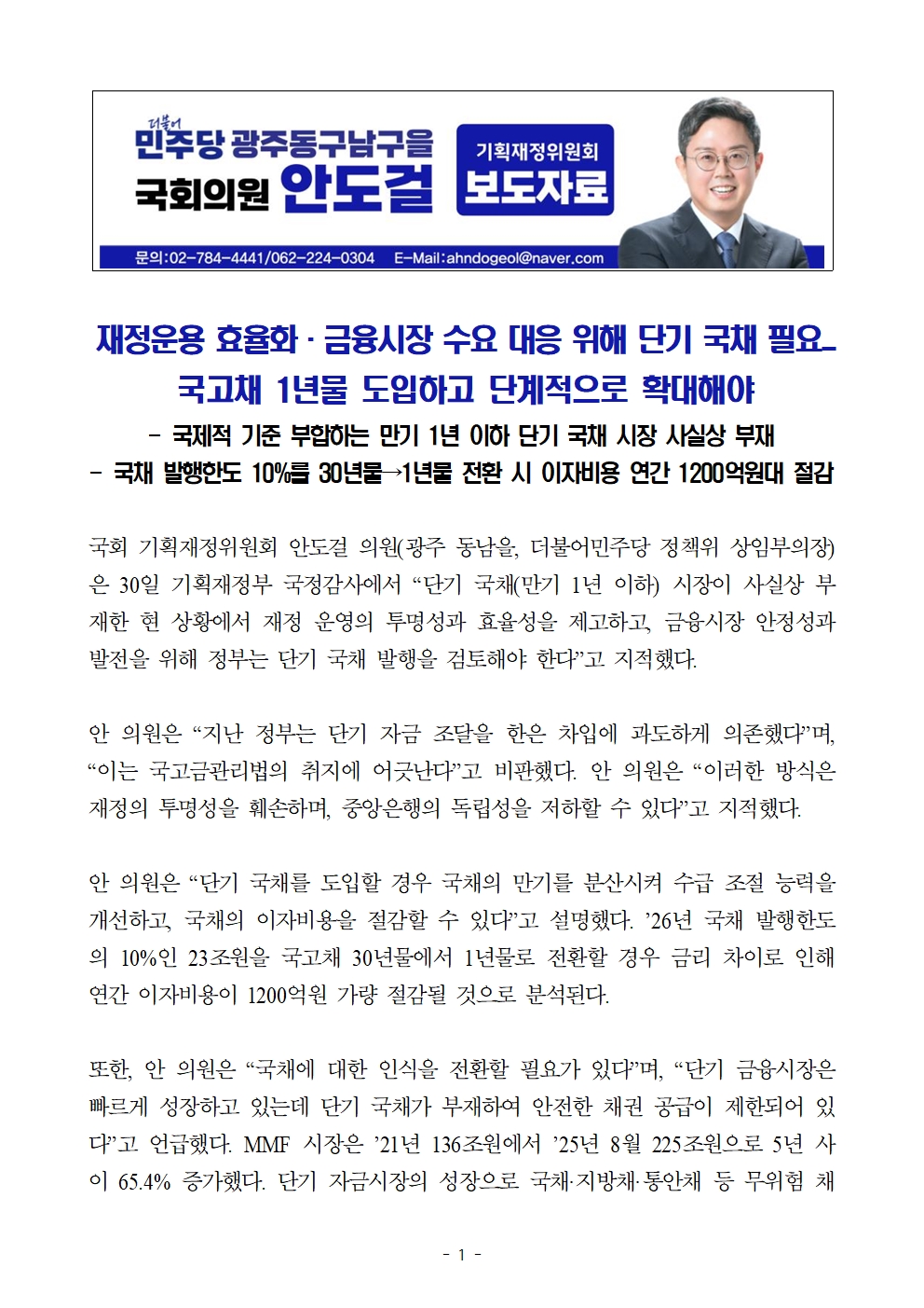 [국회의원 안도걸 보도자료] 재정운용 효율화·금융시장 수요 대응 위해 단기 국채 필요...국고채 1년물 도입하고 단계적으로 확대해야