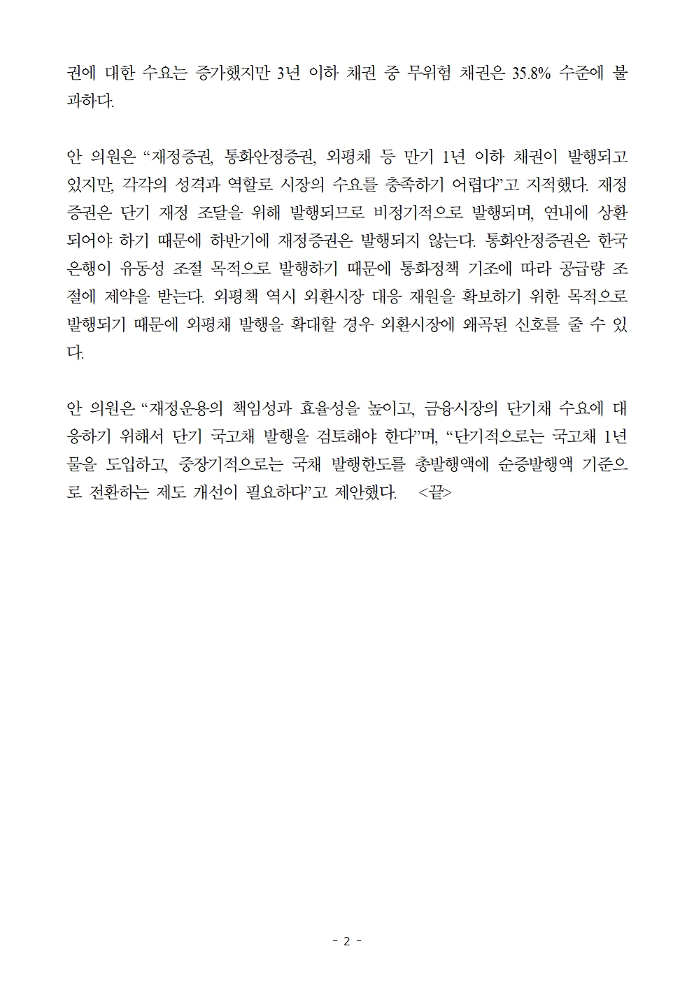 [국회의원 안도걸 보도자료] 재정운용 효율화·금융시장 수요 대응 위해 단기 국채 필요...국고채 1년물 도입하고 단계적으로 확대해야.hwp