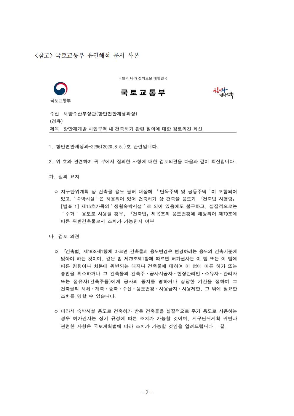 [국회의원 최인호] 해수부장관, D-3 생활숙박시설 주거용 변질 막겠다 밝혀
