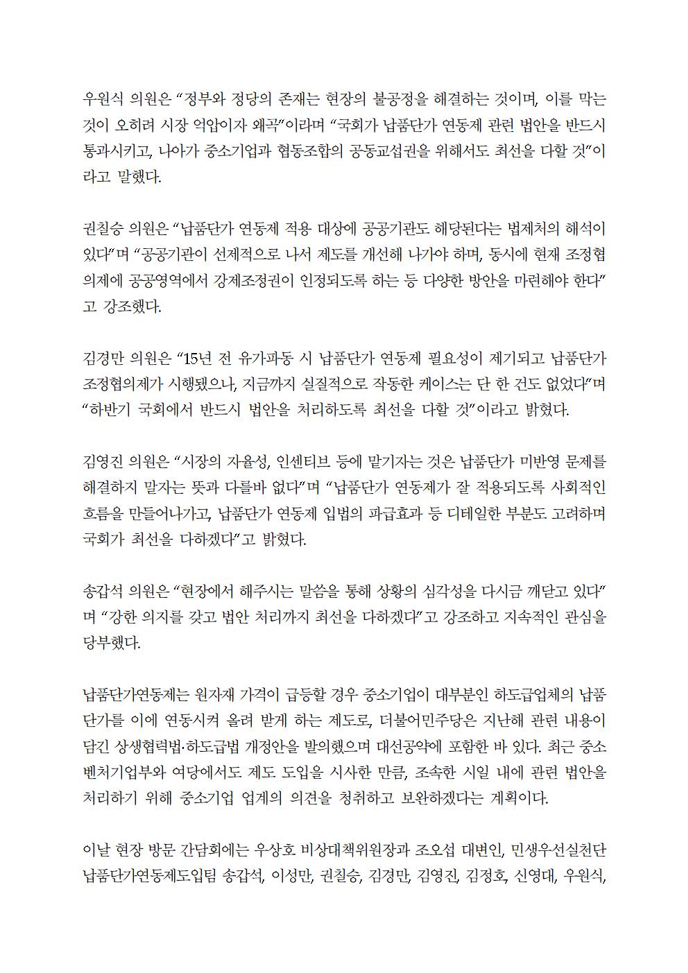 [보도자료] 더불어민주당 민생우선실천단, 납품단가연동제 도입 현장간담회 개최