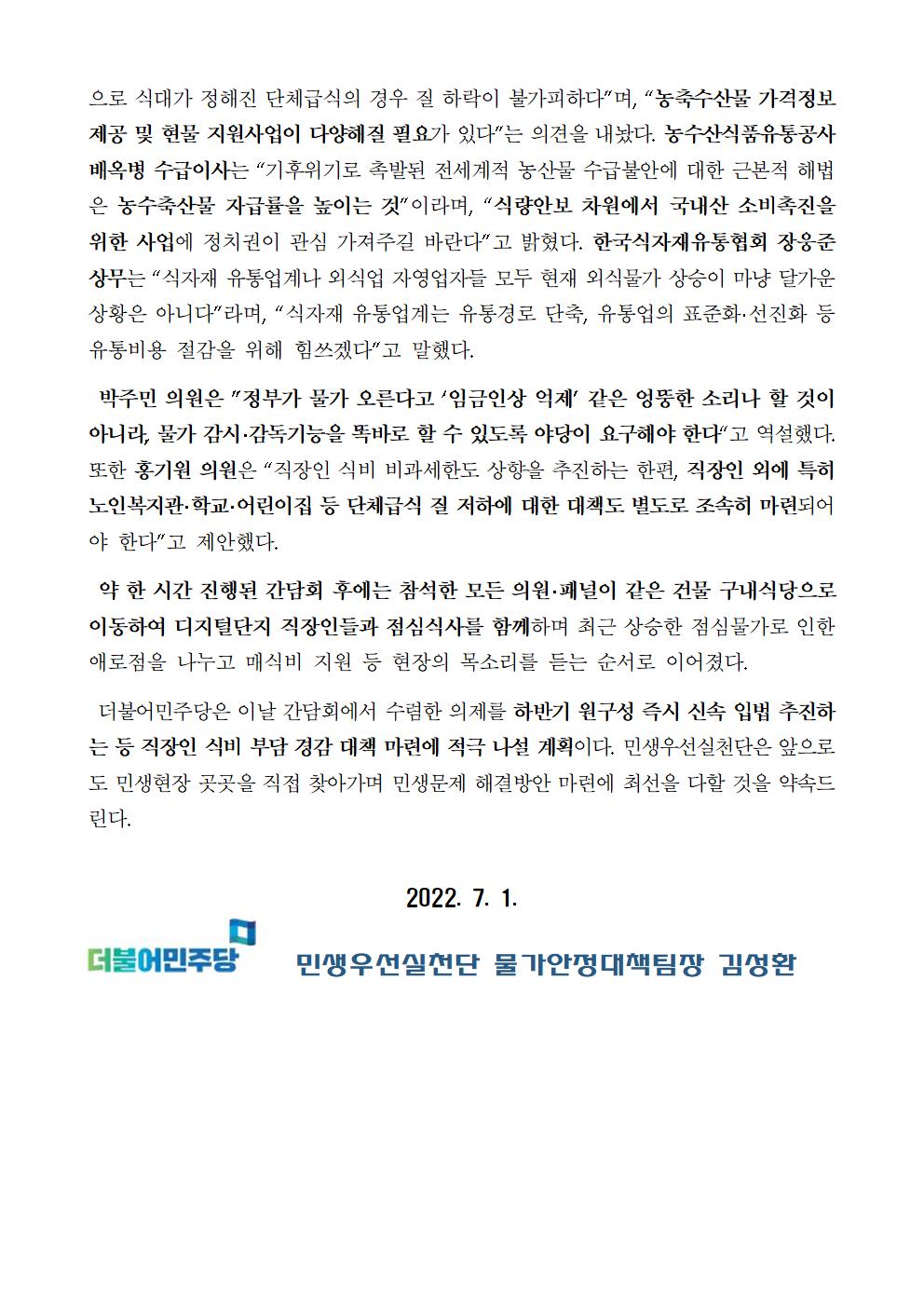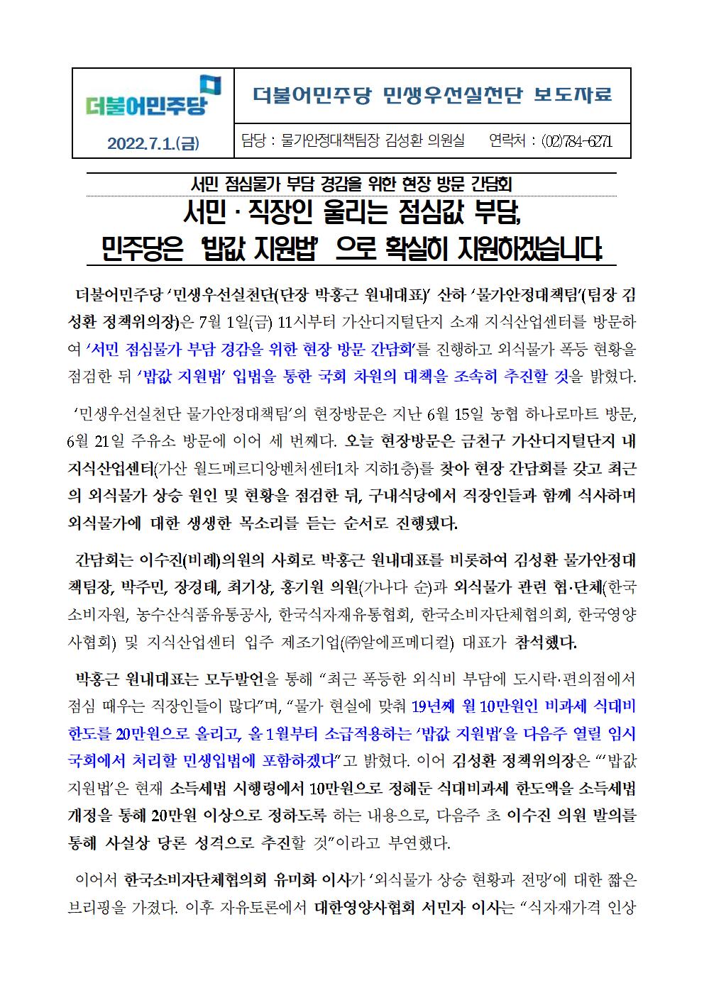 [보도자료] 더불어민주당 민생우선실천단 물가안정대책팀 서민 점심물가 부담 경감 현장 방문 간담회_밥값 지원법으로 확실히 지원하겠습니다