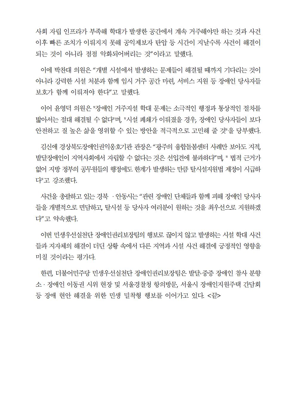 [보도자료] 민생우선실천단, 장애인권리보장팀 인권침해 발생 장애인거주시설 선산재활원 사건 해결을 위한 간담회