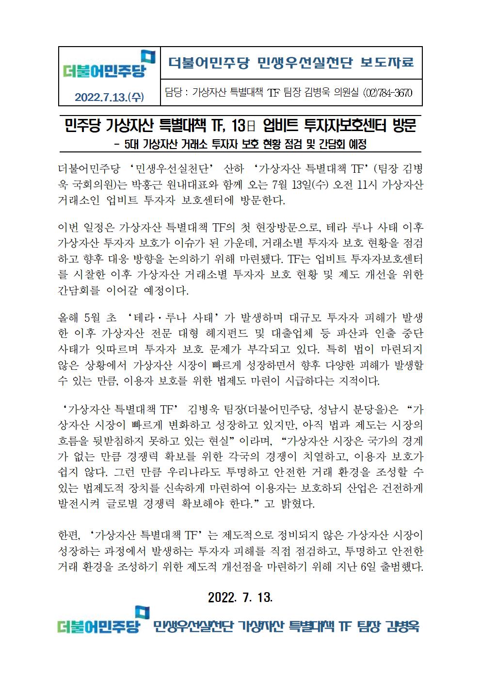 [보도자료] 민주당 민생우선실천단 가상자산 특별대책 TF, 13일 업비트 투자자보호센터 방문