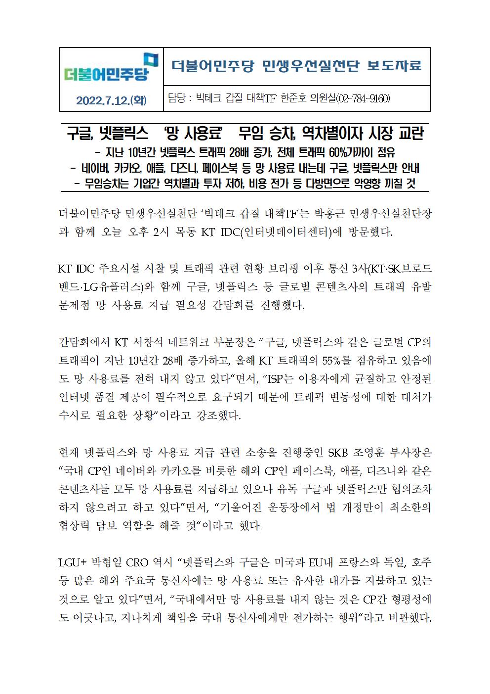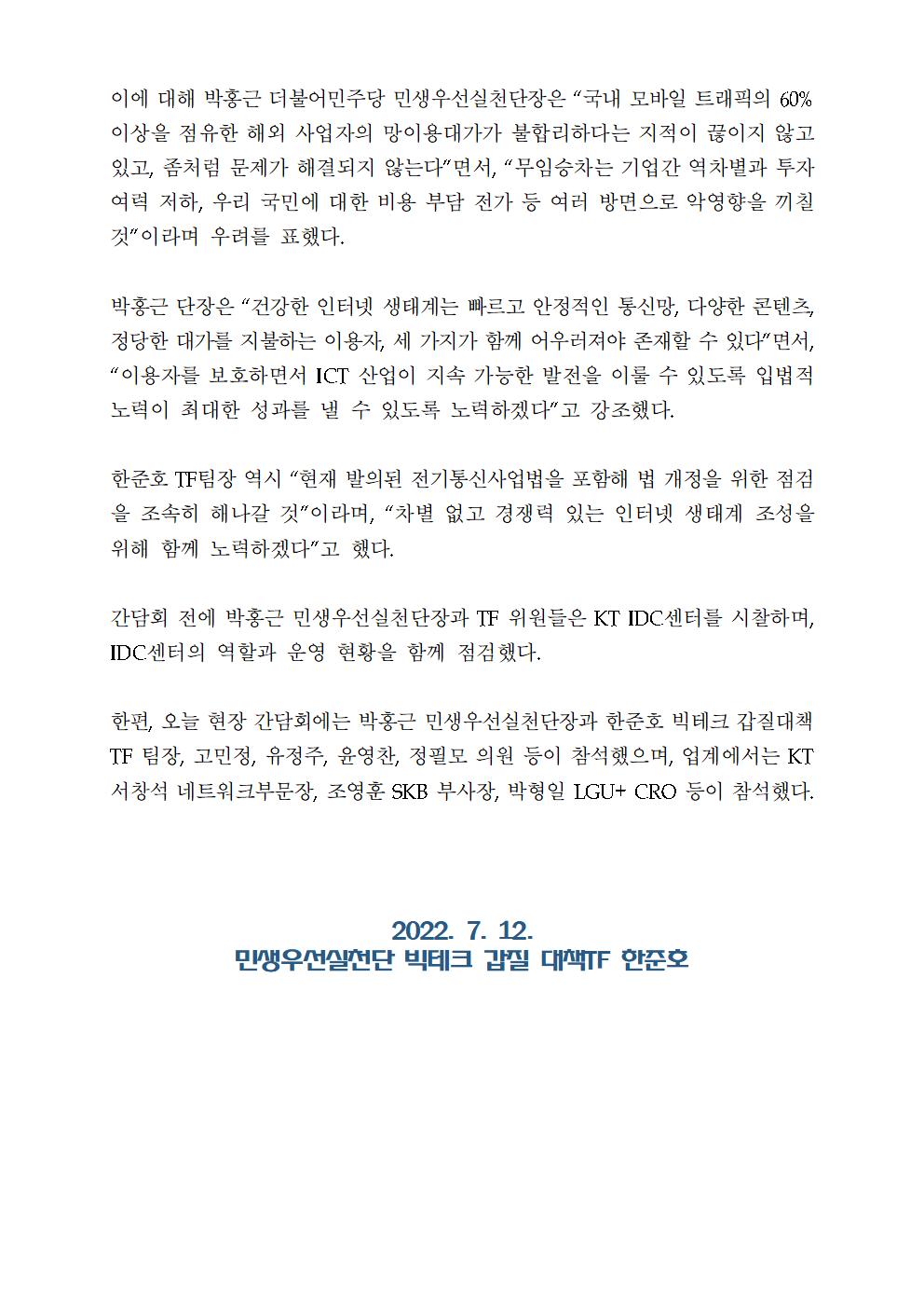 [보도자료] 더불어민주당 민생우선실천단 빅테크갑질대책tf, 망 무임승차 근절 방안 모색 관련 간담회 진행