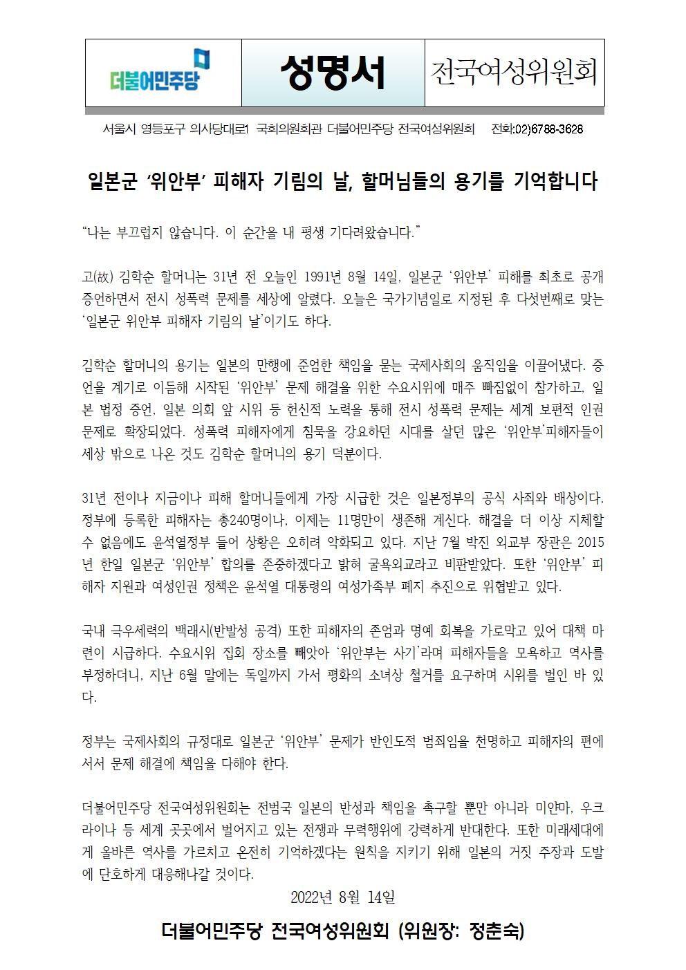 [성명서] 더불어민주당 전국여성위원회, 일본군 '위안부' 피해자 기림의날, 할머님들의 용기를 기억합니다