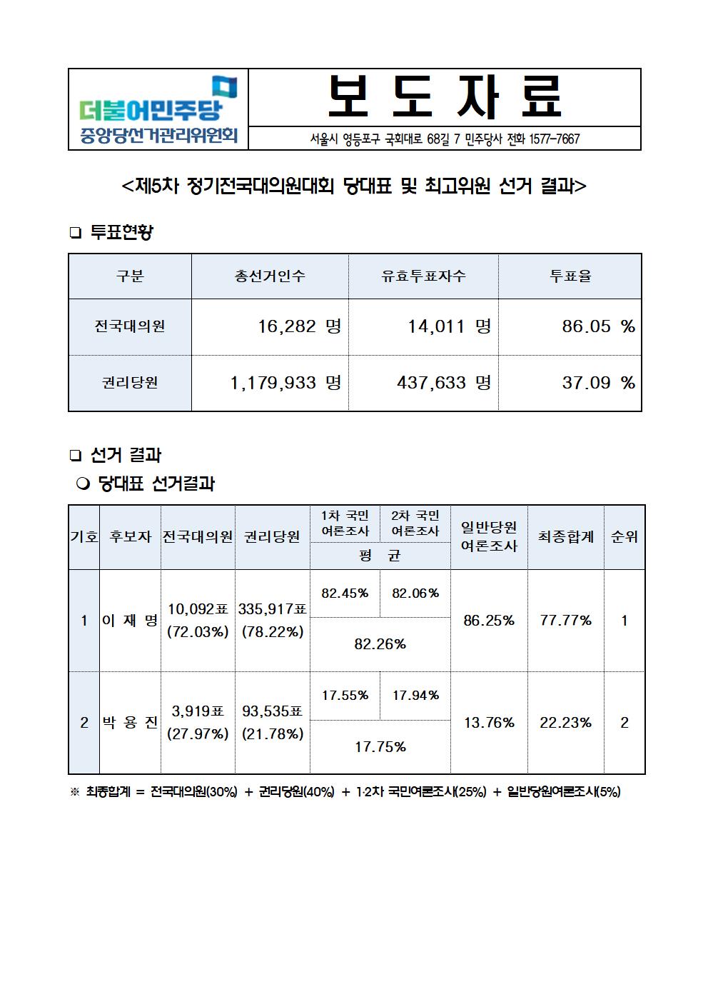 [보도자료] 제5차 정기전국대의원대회 당대표 및 최고위원 선거 결과