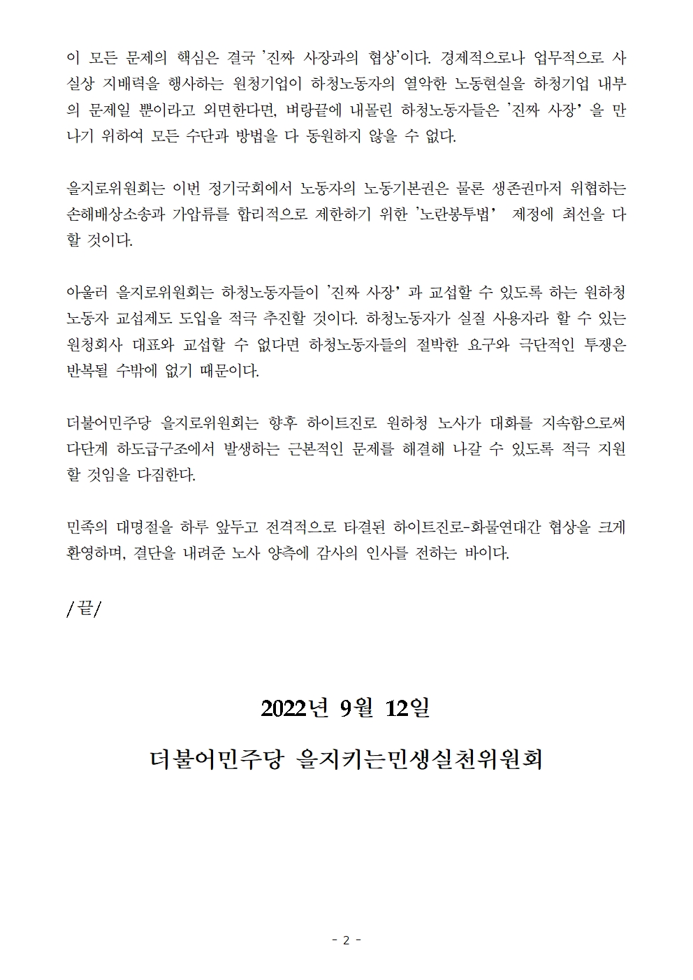[성명서] 더불어민주당 을지로위원회, 하이트진로-화물연대간 협상 타결 환영, 원하청 노동자 교섭제도 도입 촉구