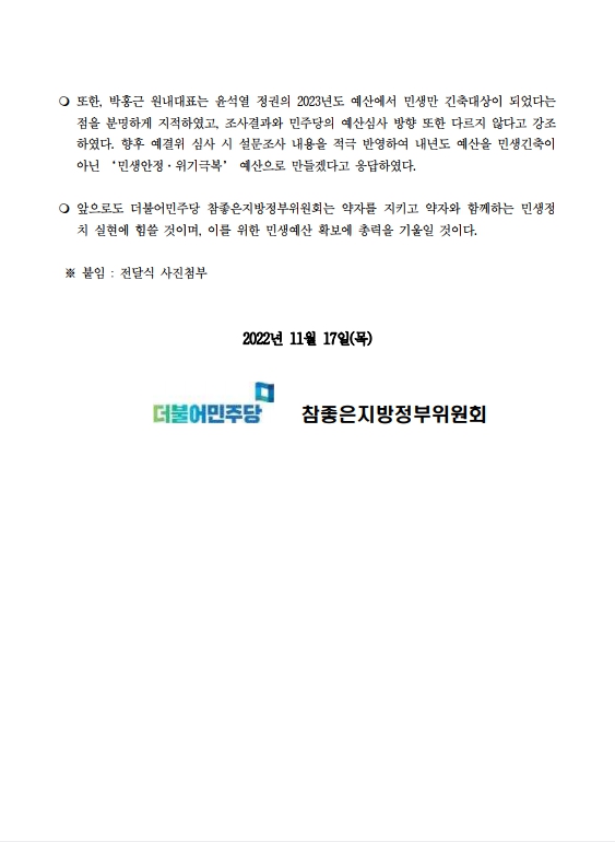[보도자료] 더불어민주당 참좋은지방위원회, 윤석열 정권의 2023년도 민생예산 삭감에 대한 의견서 전달식 개최