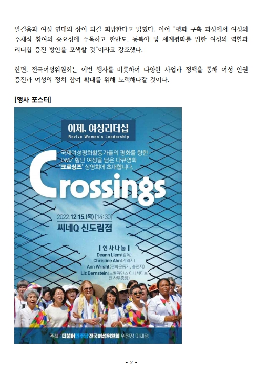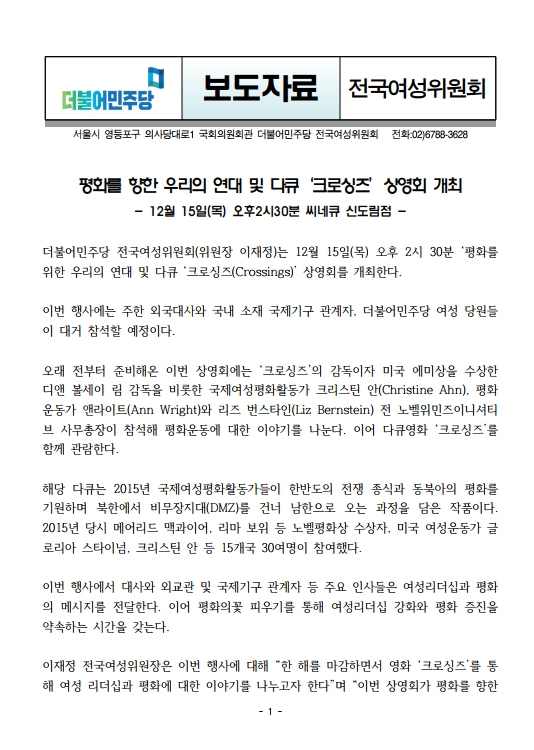 [보도자료] 더불어민주당 전국여성위원회, 평화를 향한 우리의 연대 및 다큐 ‘크로싱즈’ 상영회 개최