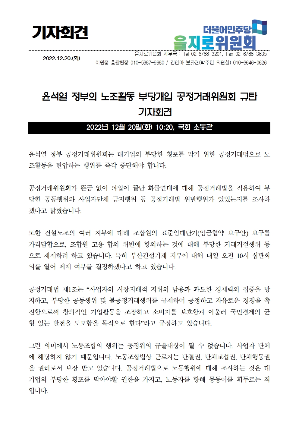 [기자회견문] 더불어민주당 을지로위원회, 윤석열 정부의 노조활동 부당개입 공정거래위원회 규탄