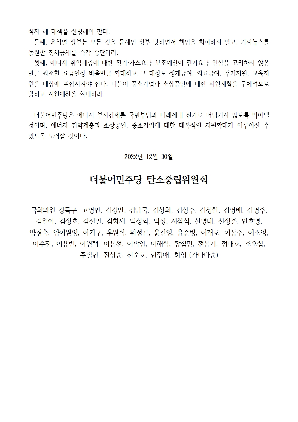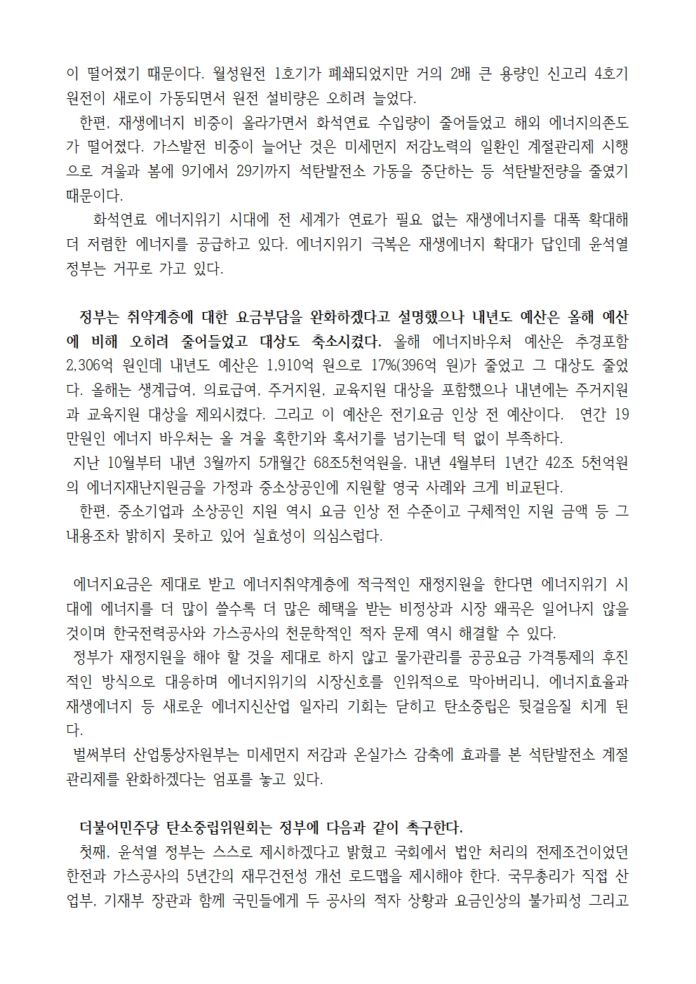 [입장문] 더불어민주당 탄소중립위원회, 윤석열 정부의 전기·가스요금 조정방안은 졸속 대책