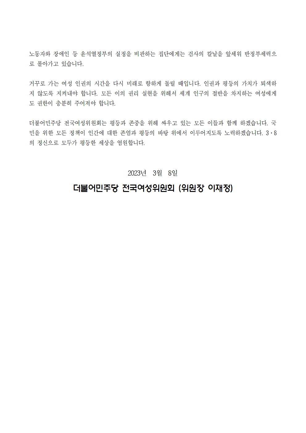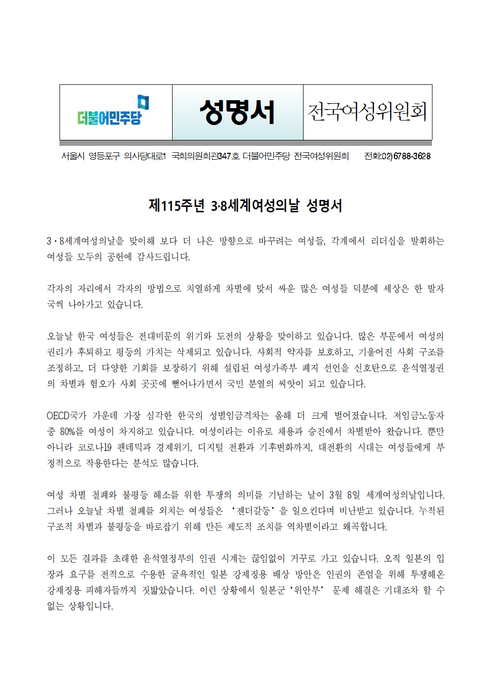 [성명서] 더불어민주당 전국여성위원회, 제115주년 3·8세계여성의날 성명서