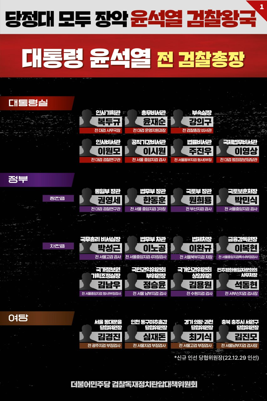 20대 대통령 선거 전부터 많은 국민께서 윤석열 후보가 대통령에 당선되면 정부여당이 검사일색으로 채워지는 것은 아닌지 우려하였습니다. 집권 1년 만에 우려는 이제 현실이 되었습니다. 검찰출신이 정부·여당, 그리고 대통령실의 요직이란 요직은 모두 차지하였습니다.