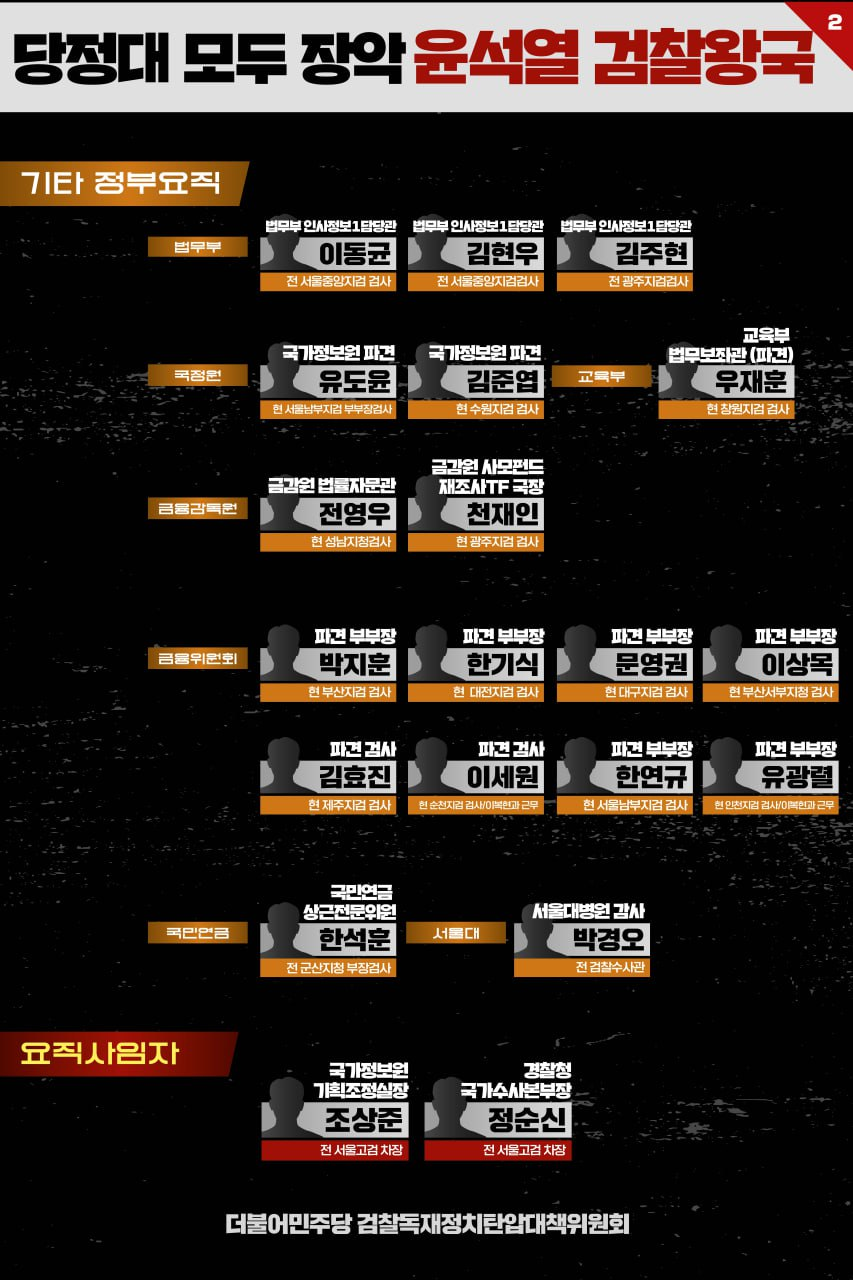 정부에는 장관급만 권영세, 한동훈, 원희룡, 박민식 4명에 차관급은 법무부 이노공 차관을 필두로 8명에 이릅니다. 금융감독원장에 국민권익위원회 부위원장, 민주평통 사무처장, 국무총리 비서실장까지. 검사 권능에 한계는 없습니다.