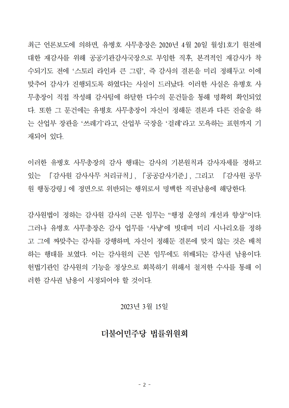 [보도자료] 더불어민주당 법률위원회, 유병호 감사원 사무총장 직권남용죄로 고발장 접수