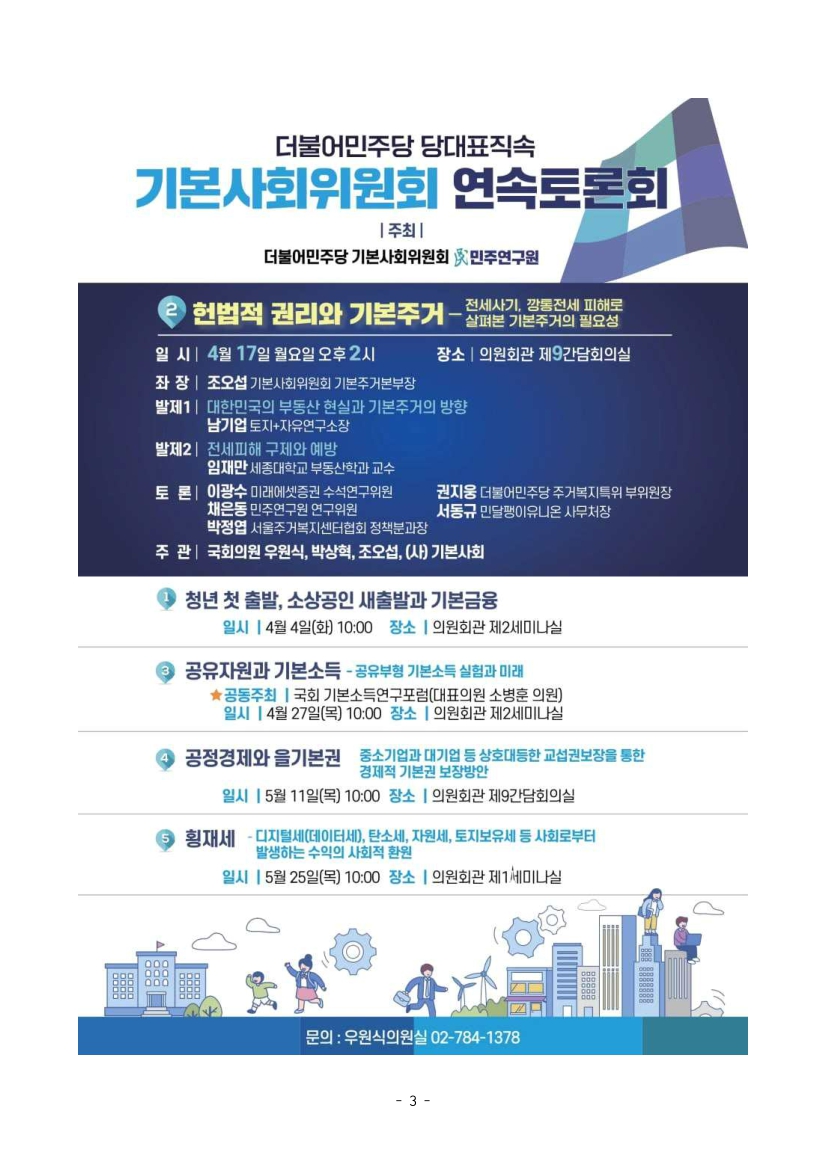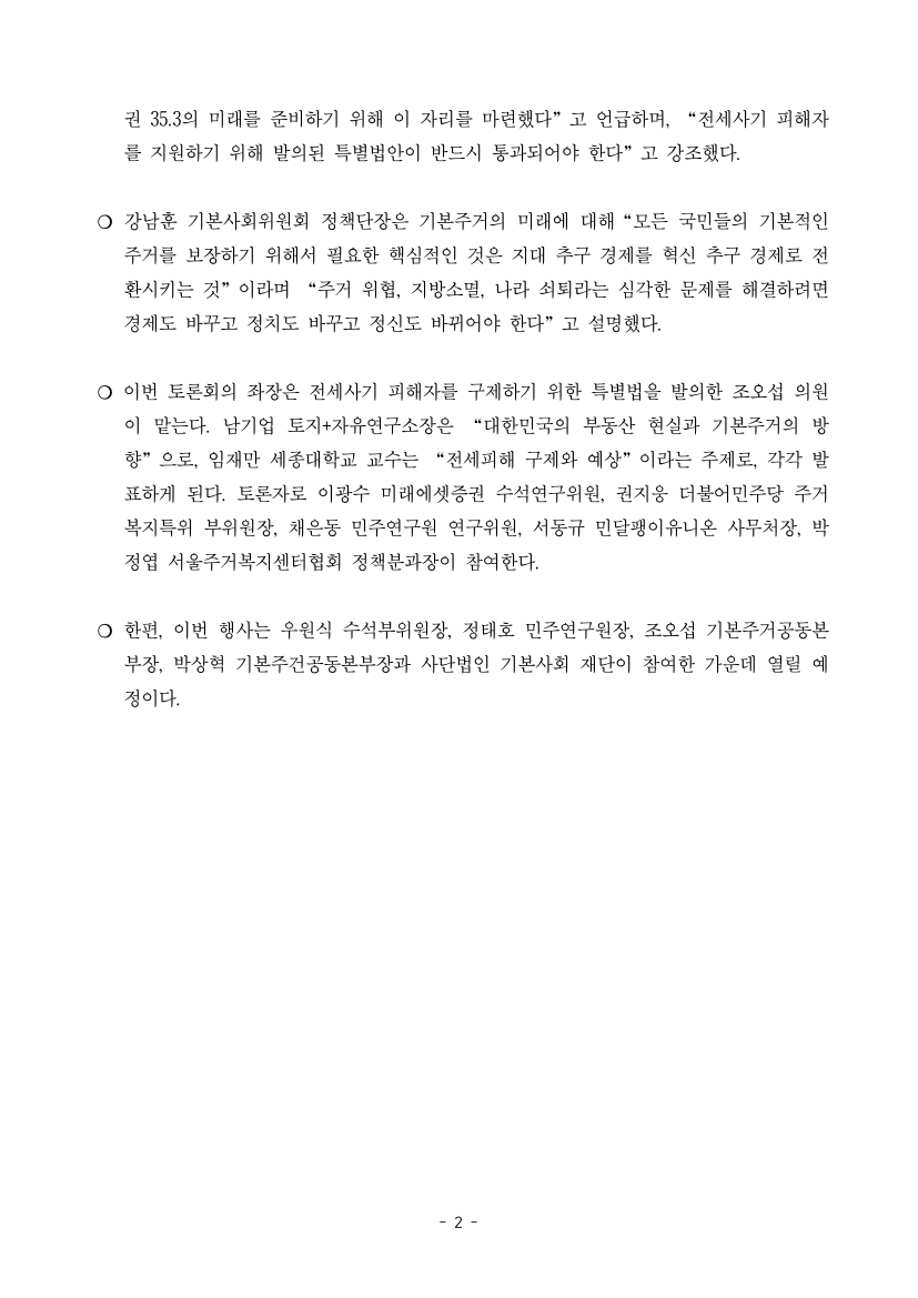 [보도자료] 더불어민주당 기본사회위원회ㆍ민주연구원, 제2차 토론회 "헌법적 권리와 기본주거:전세사기, 깡통전세 피해로 살펴본 기본주거의 필요성" 진행