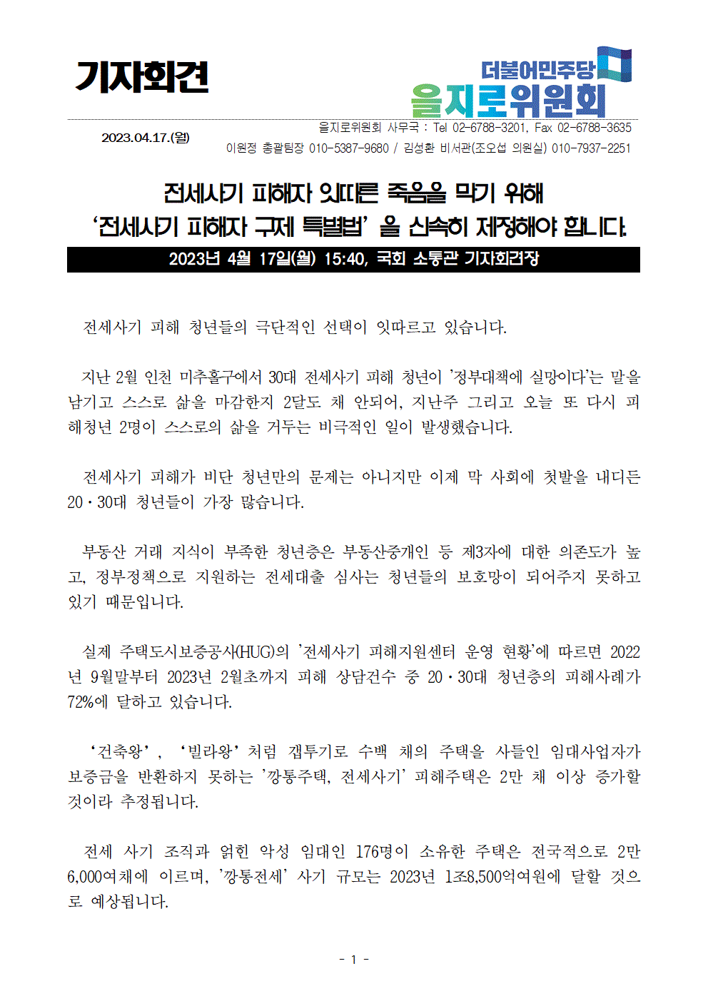 [기자회견문] 더불어민주당 을지로위원회, 전세사기 피해자 잇따른 죽음을 막기 위해 ‘전세사기 피해자 구제 특별법’을 신속히 제정해야 합니다.