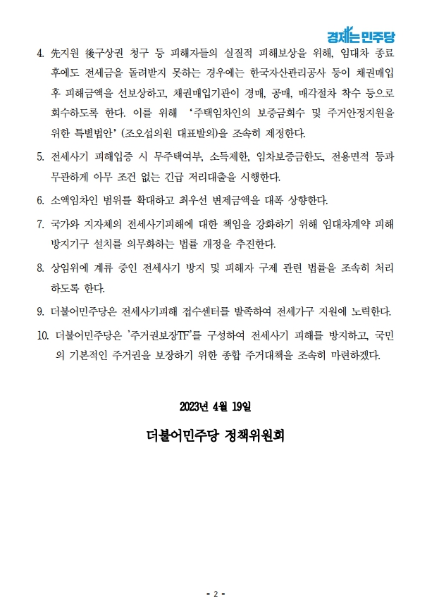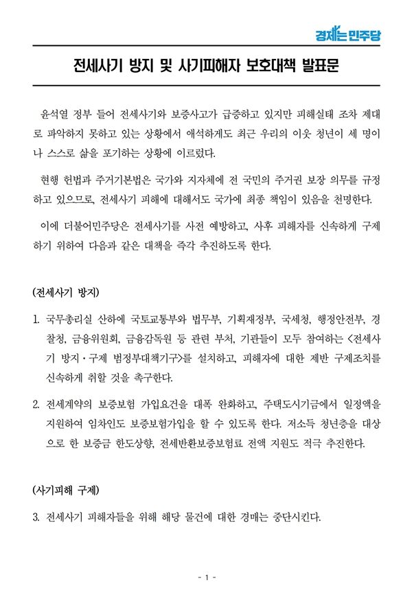 [기자회견문] 더불어민주당 정책위원회, 전세사기 방지 및 사기피해자 보호대책 발표